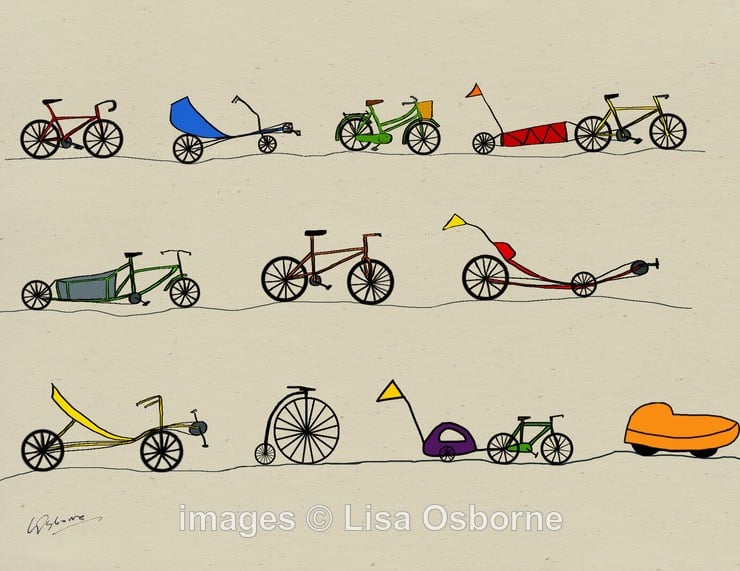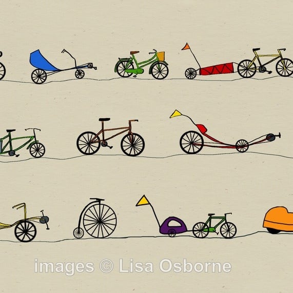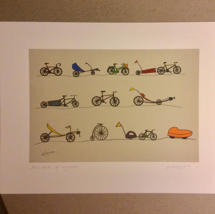 All sorts of cycles - colourful, open edition print of bicycles and other types of cycles.