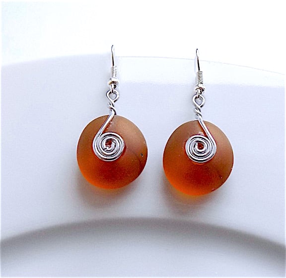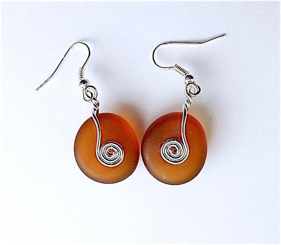 beach found sea glass dangle earrings, sizes including hanging and earwires, length 40 mm ( 4 cm ) sea glass 17 X 15 mm, depth of sea glass 7 mm, spiral hanging and ear wires silver plate. Last image is back of earrings. I love sea washed glass and spend many happy hours beach combing to find these treasures and to find near matches is very difficult, making all these stunning earrings very unique and special. Finished in tumbler for a really smooth silky finish, both have a few air bubbles.