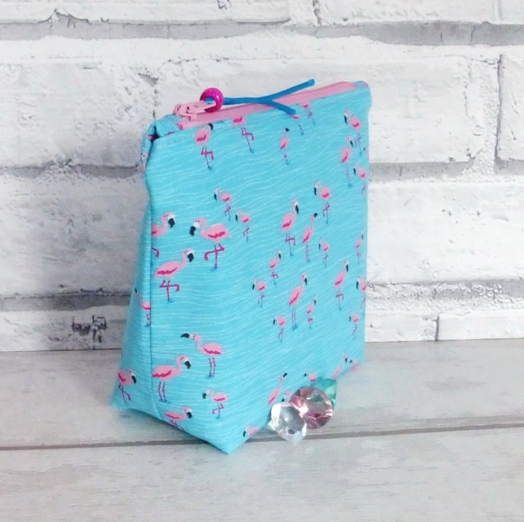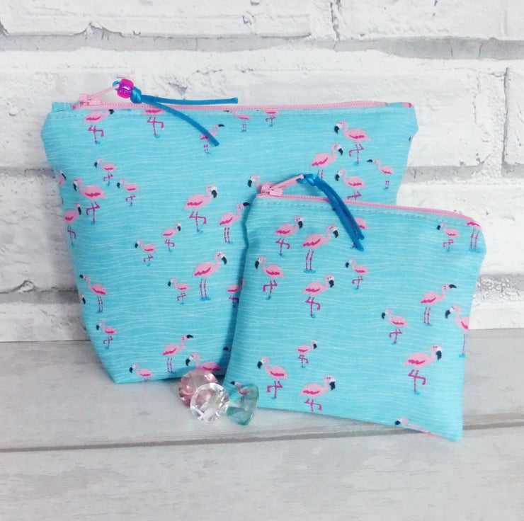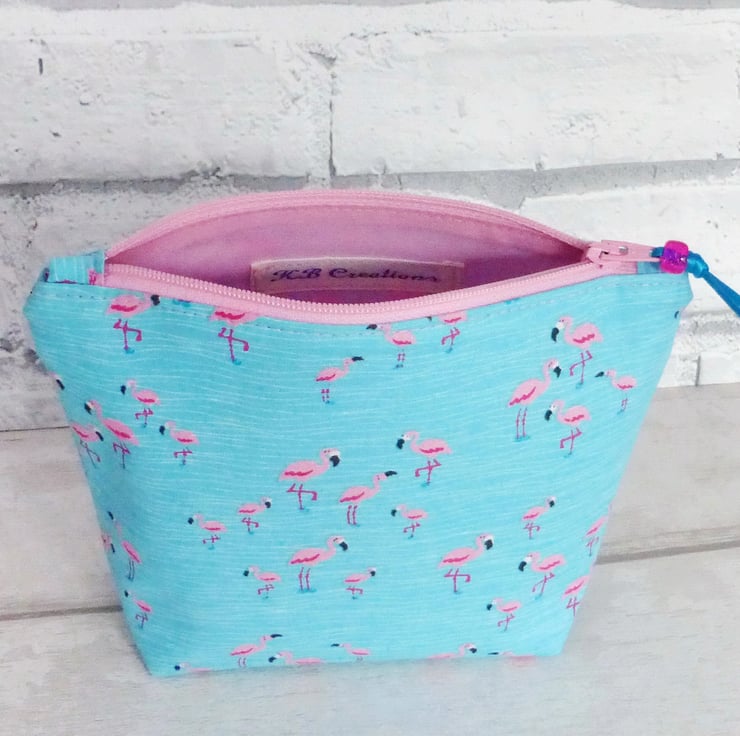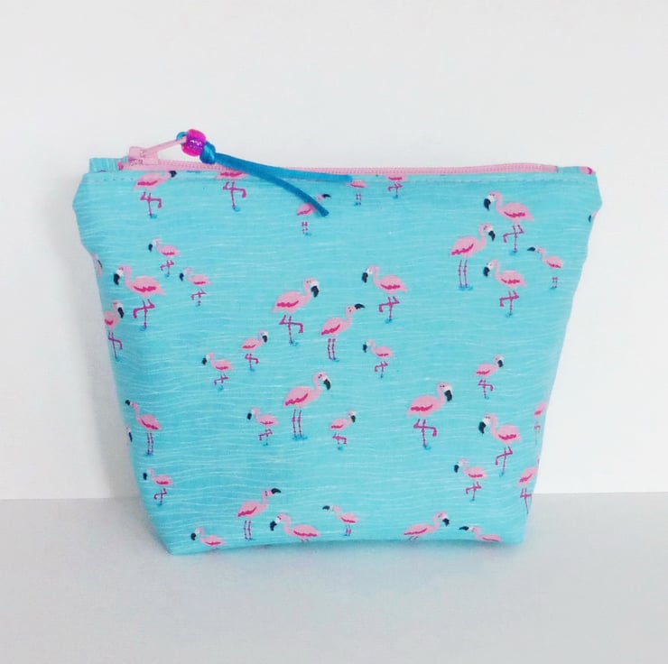 A medium sized make up bag/zipped pouch made from cotton fabric with a pink flamingos on a blue 'water effect' background. Lined in a plain pink cotton fabric.