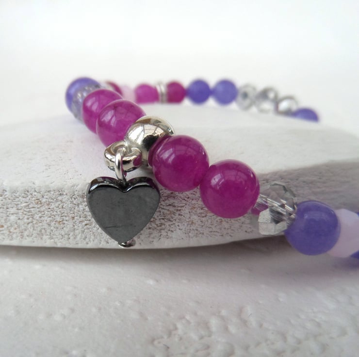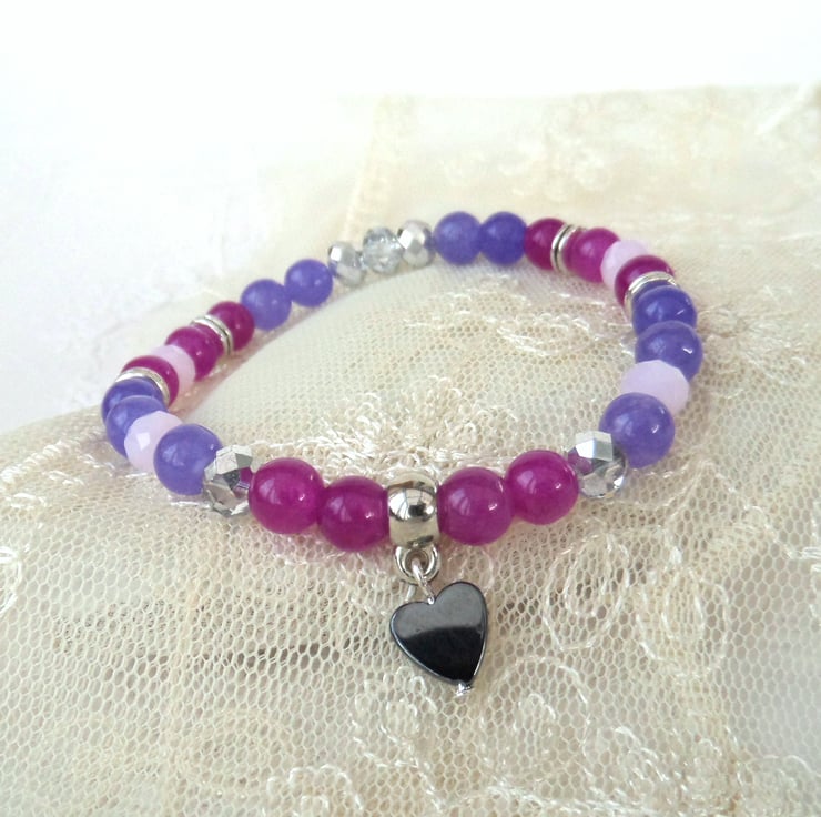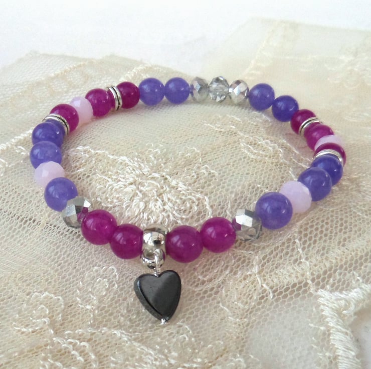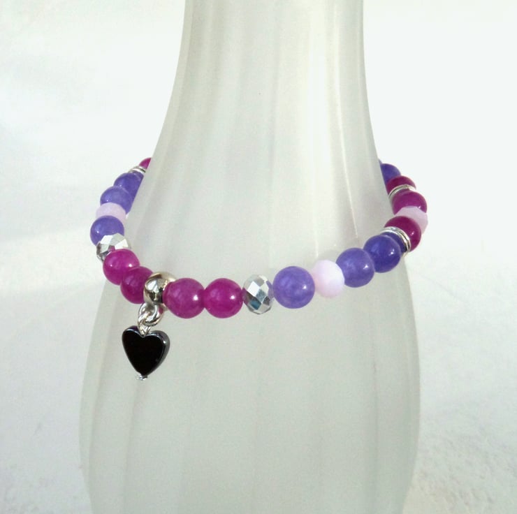 A dainty stretchy bracelet, made with 6 mm quartz, jade & crystal purple, pink & silver beads.