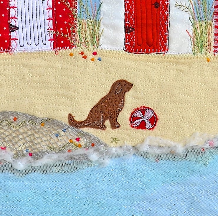 Beach Huts is made from layers of fabric using the raw edge appliqué technique and embellished with free motion embroidery. This is where an artist uses a sewing machine needle to draw freehand onto fabric, creating art in the same way as with a pencil. No computer wizardry is involved, it is all done by eye and hand, taking many hours of meticulous crafting.