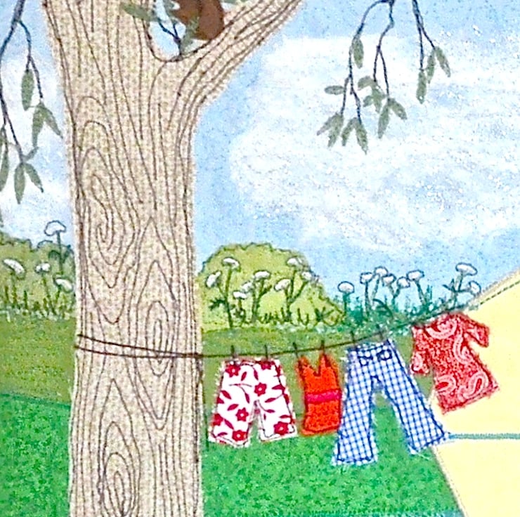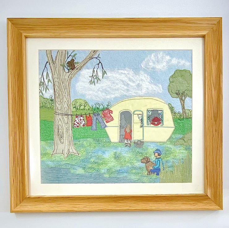 The Caravan is made from layers of fabric which are free motion embroidered. Many hours of hand crafted work has gone into the preparation, construction and presentation of this artwork, so that it is ready to hang and grace your wall!
