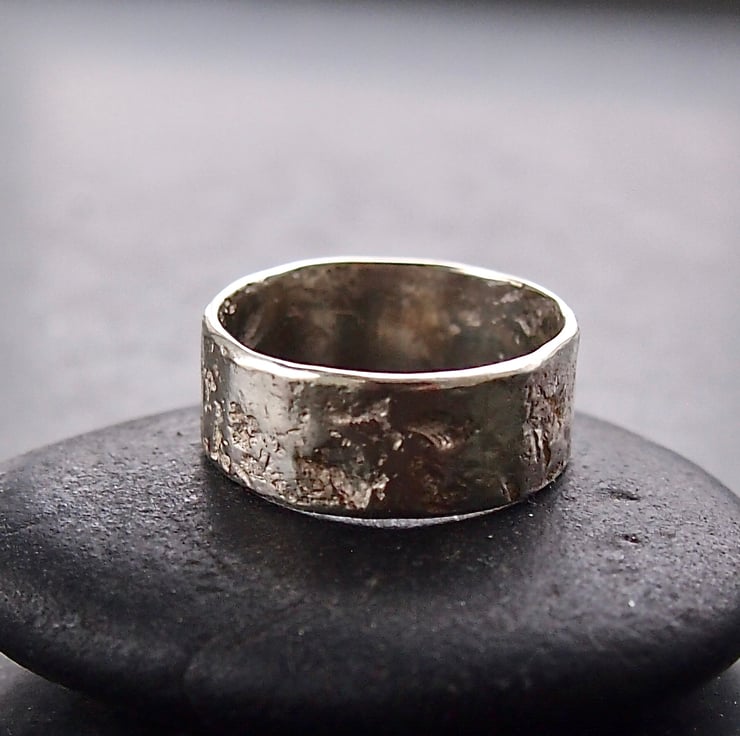 A band of sterling silver has been textured and then polished. The forging means that it has an organic feel but I have bevelled and polished the edges for comfort and for a nice finish.The silver is 7mm wide and 1mm thick and has a nice weight. This is similar to our 10mm band but slimmer and easier to wear.