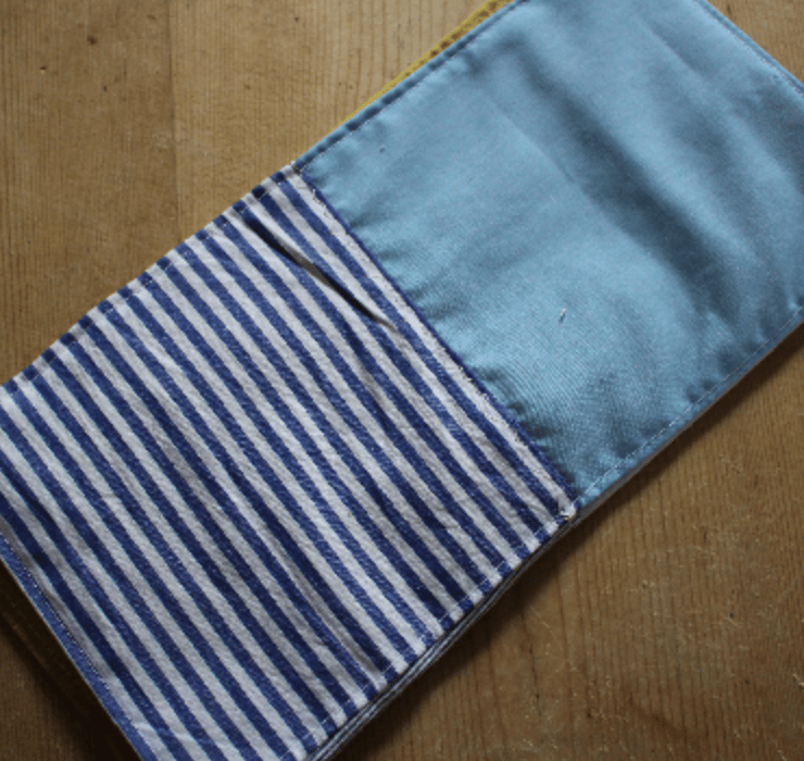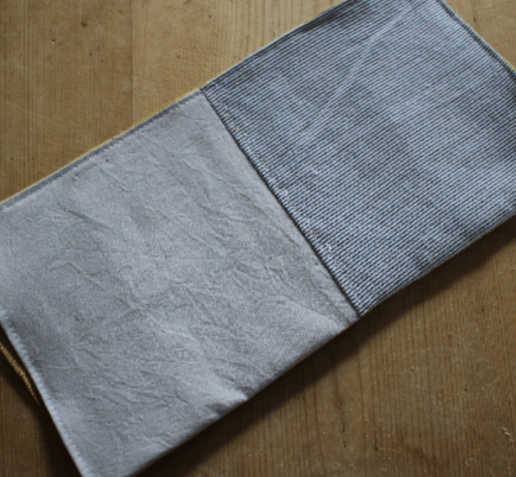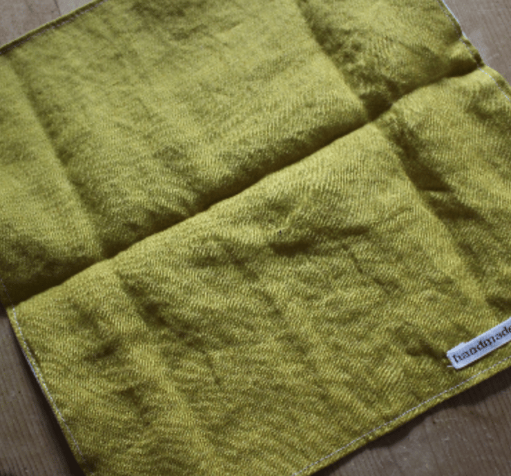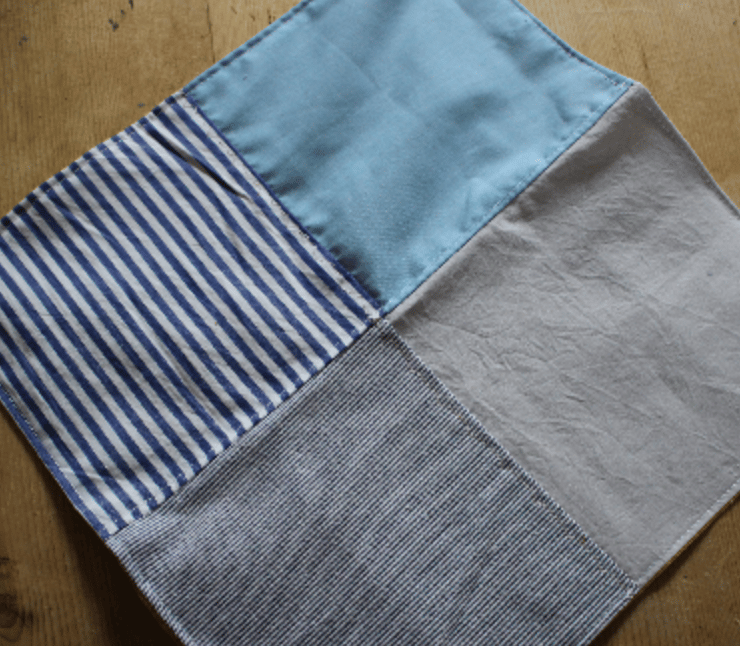 Handmade patchwork handkerchief in a mix of cottons and linens. The dual layer handkerchief has a top layer that uses handout shapes, pieced together and then added to a layer of soft washed linen.