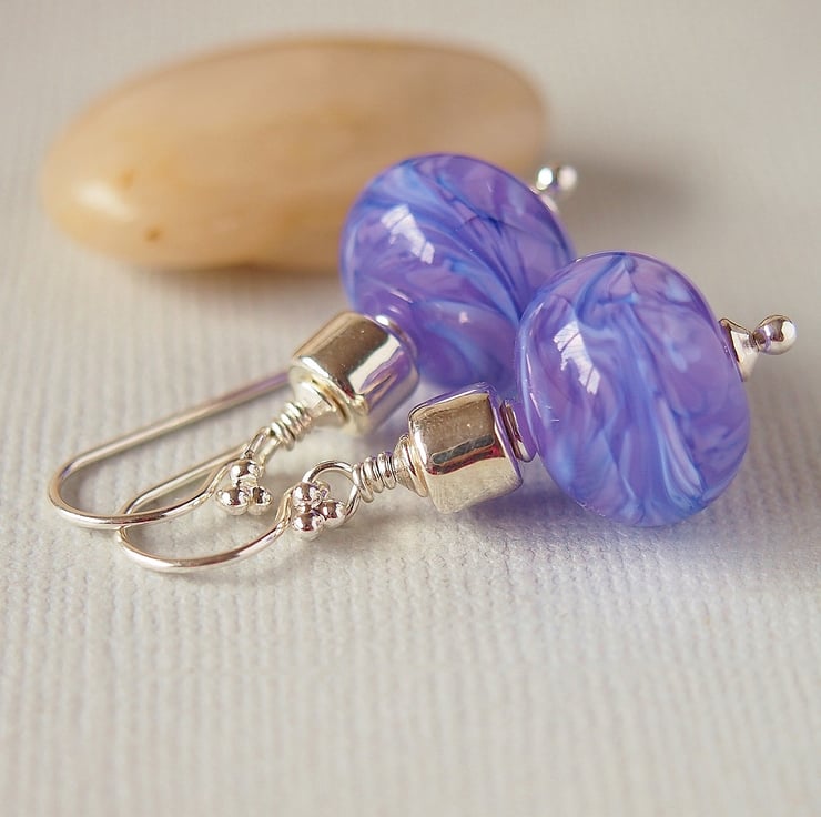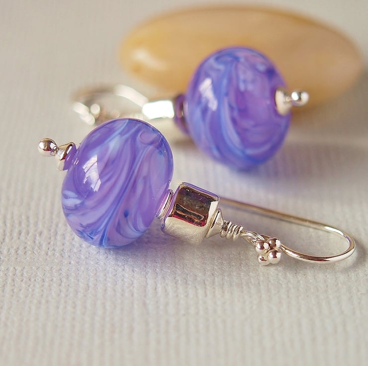 Beautiful handmade earrings featuring gorgeous mauve swirl lampwork glass beads made by UK artisan Doris John.