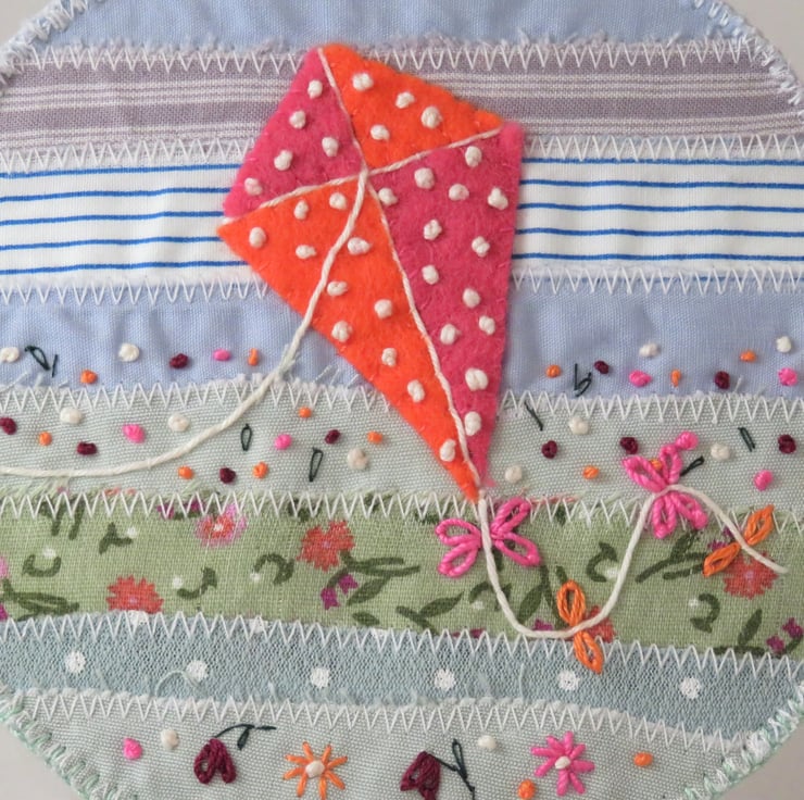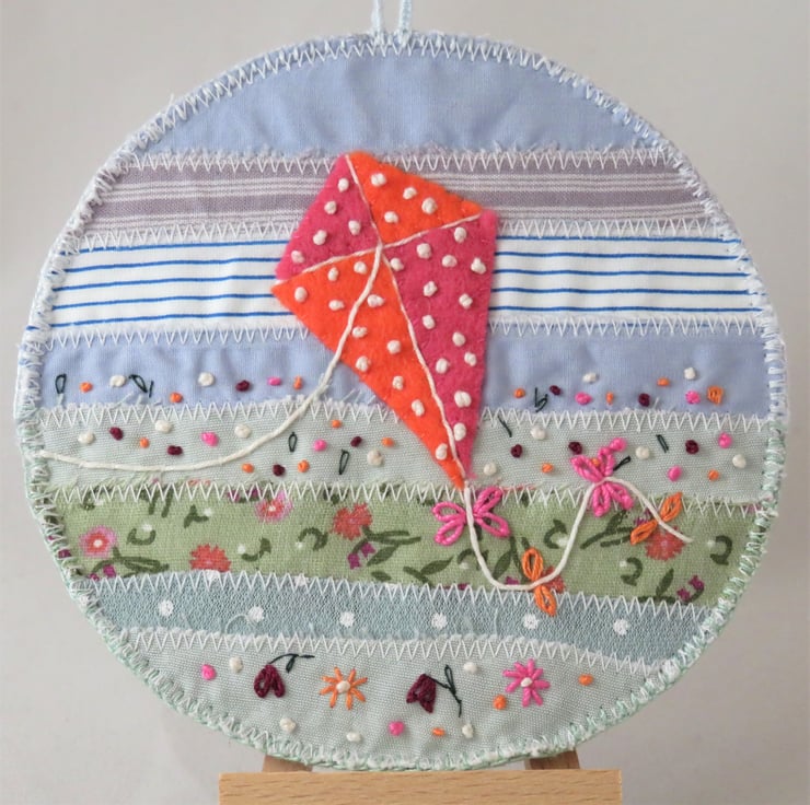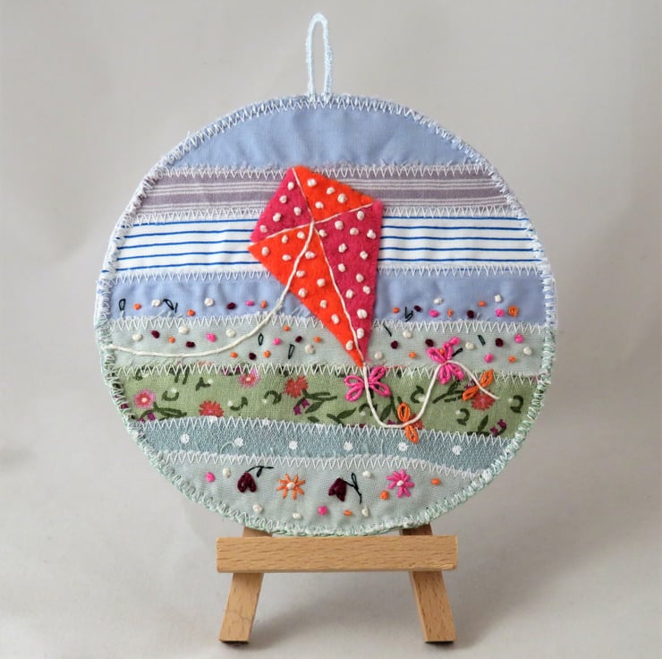 The background of this plaque has been created from machine appliqued strip patchwork on a plain fabric base. One of the strips is of printed flowers on a green background. These flowers have been replicated in hand embroidery on other 'meadow' stripes. The kite shape, cut from bright pink and orange felt, has been appliqued in place and enhanced with hand embroidery.
