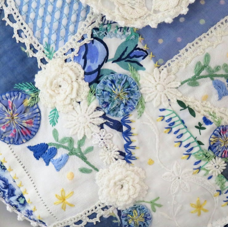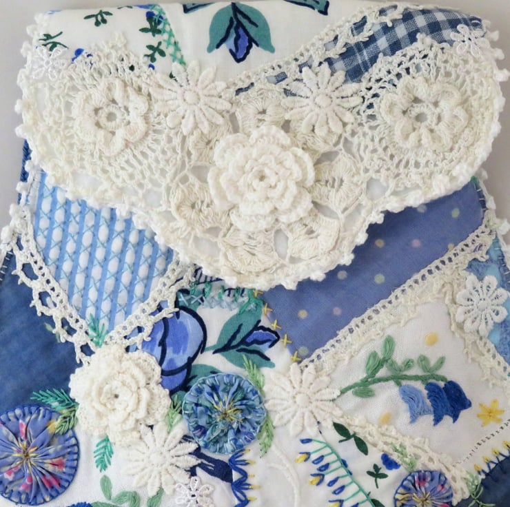 A beautiful, embroidered, crazy patchwork bag in shades of blue and white - stitched from vintage linens and lace, and hand embroidered.