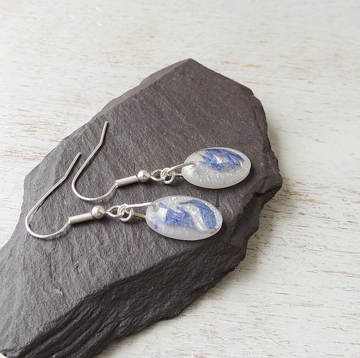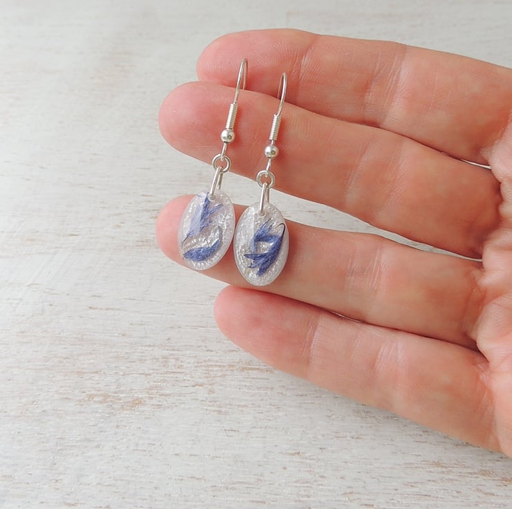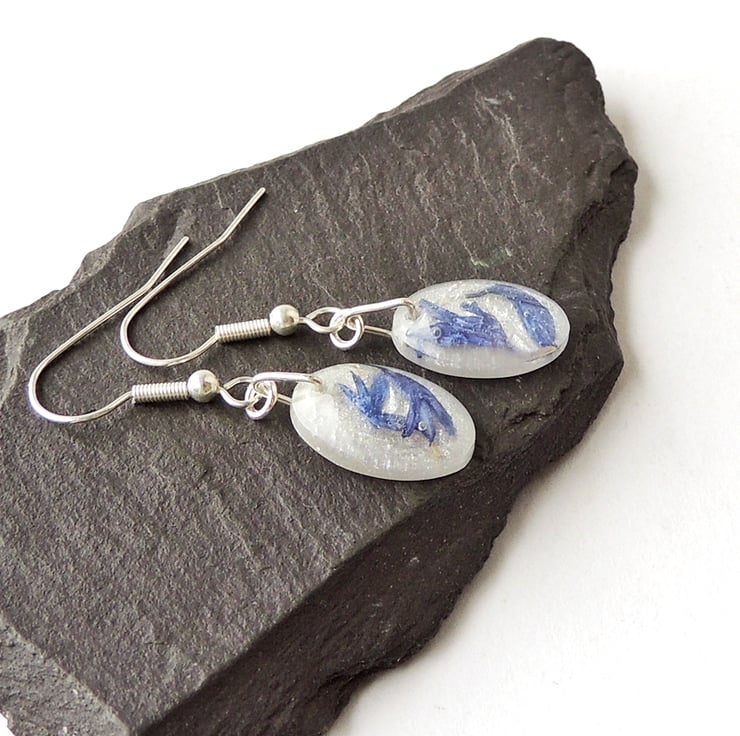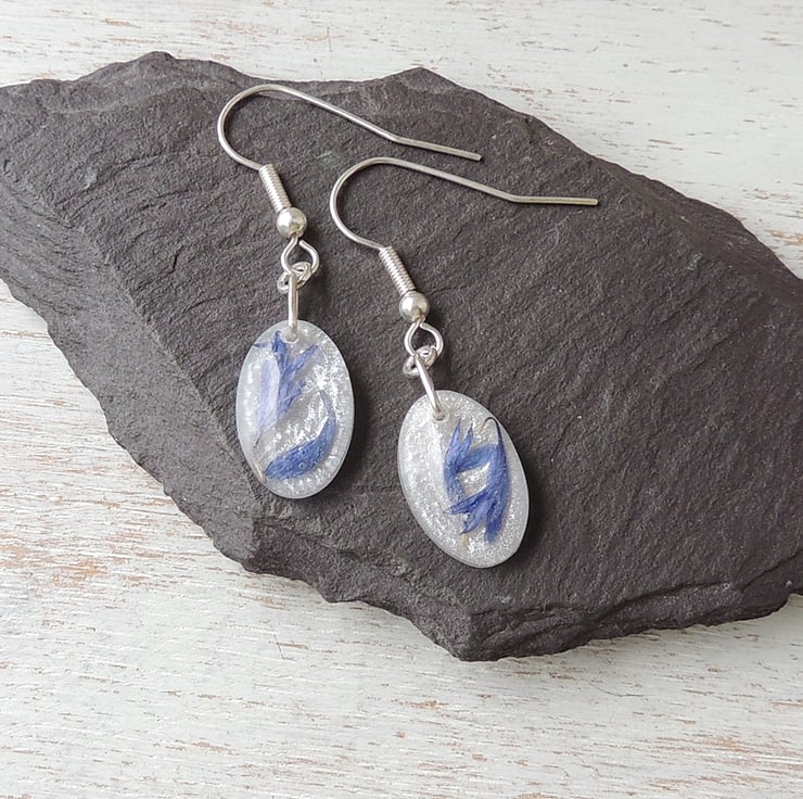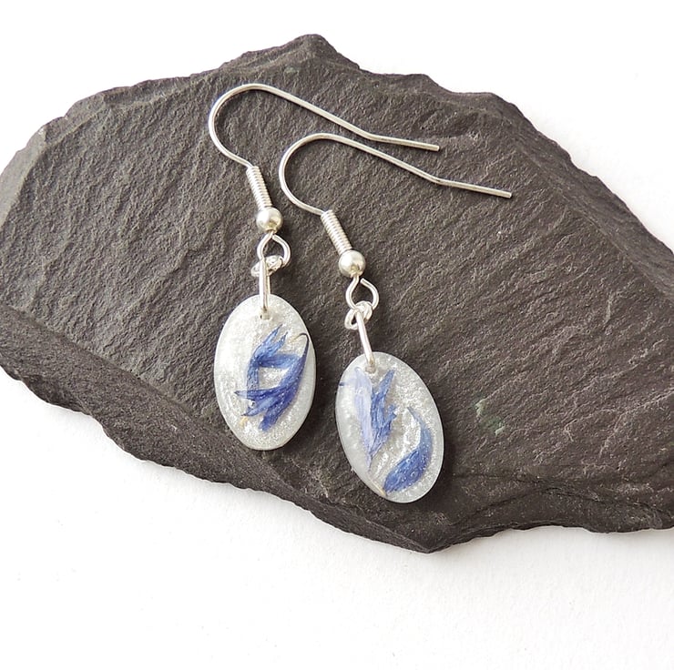 These earrings have blue cornflower petals in white resin drops on silver plated fish hook ear wires.