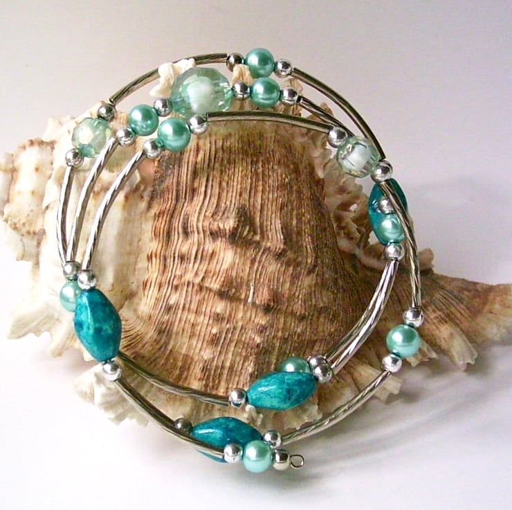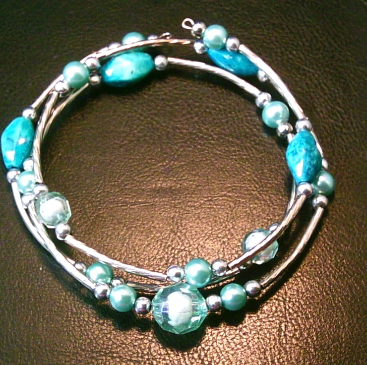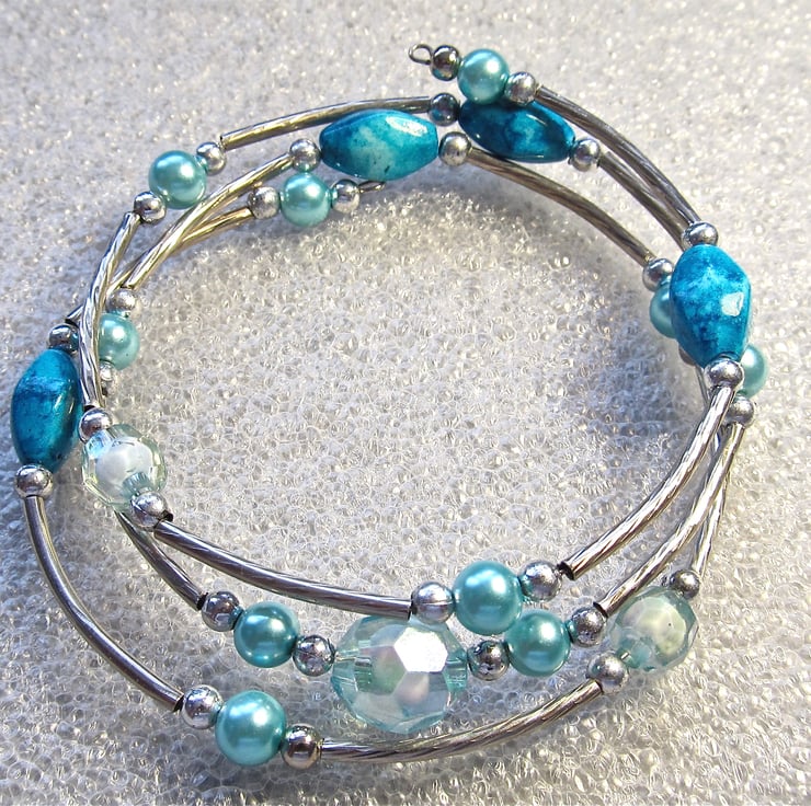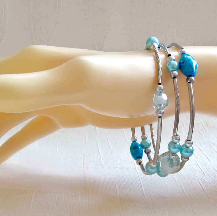 With 3-tiers, this memory bracelet/bangle, made with faux (glass) pearls in a beautiful sky blue colour, together with large turquoise blue acrylic bicone beads is quite a statement piece. All the main beads are complemented with silver-toned embellishments.