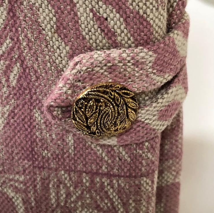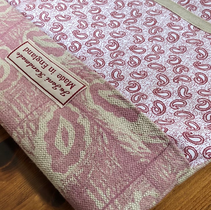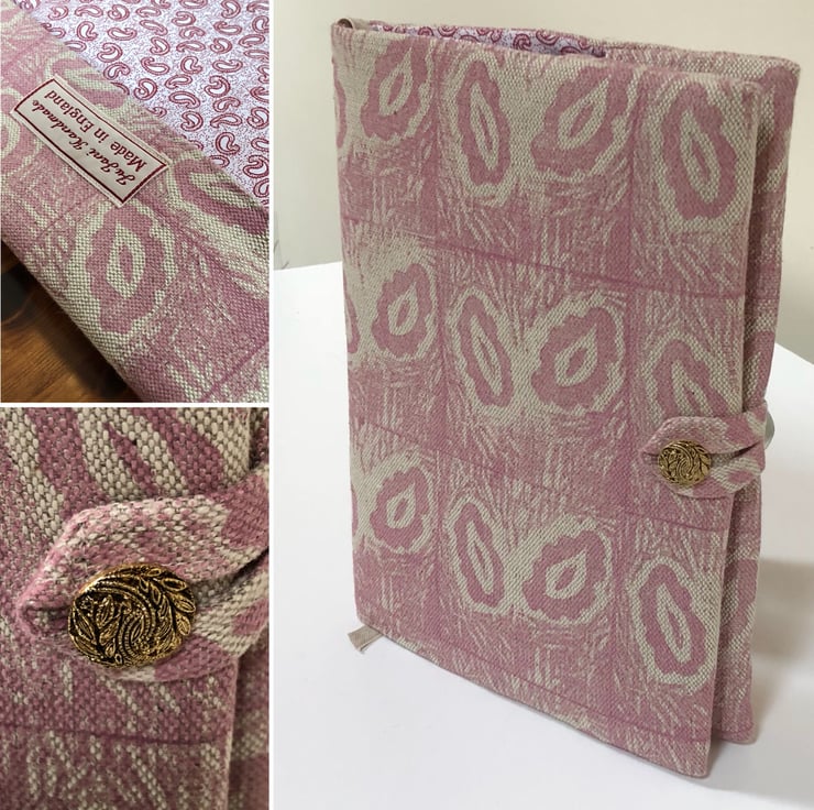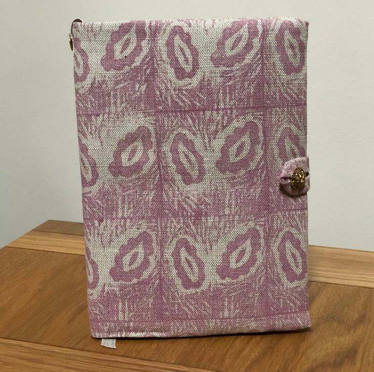 This attractive covered notebook has been made from a beautiful fabric that I have created by carving a Lino block and hand printing the design on to a quality linen. I have lined it with a contrasting cotton fabric.The book has a fabric and decorative button closure with a dutch linen tape bookmark.A ' made with love' charm has been added to the outside cover for decoration.