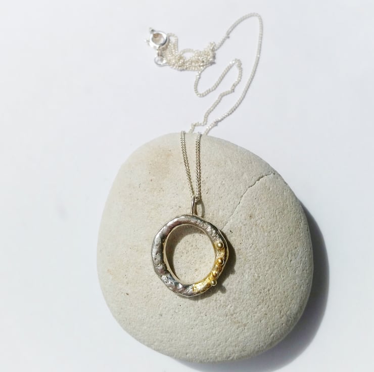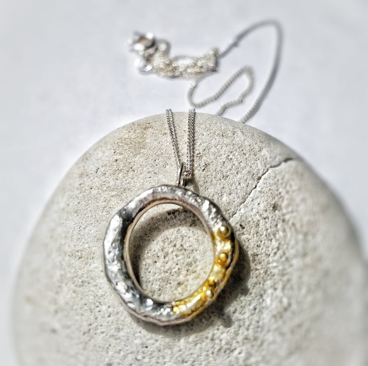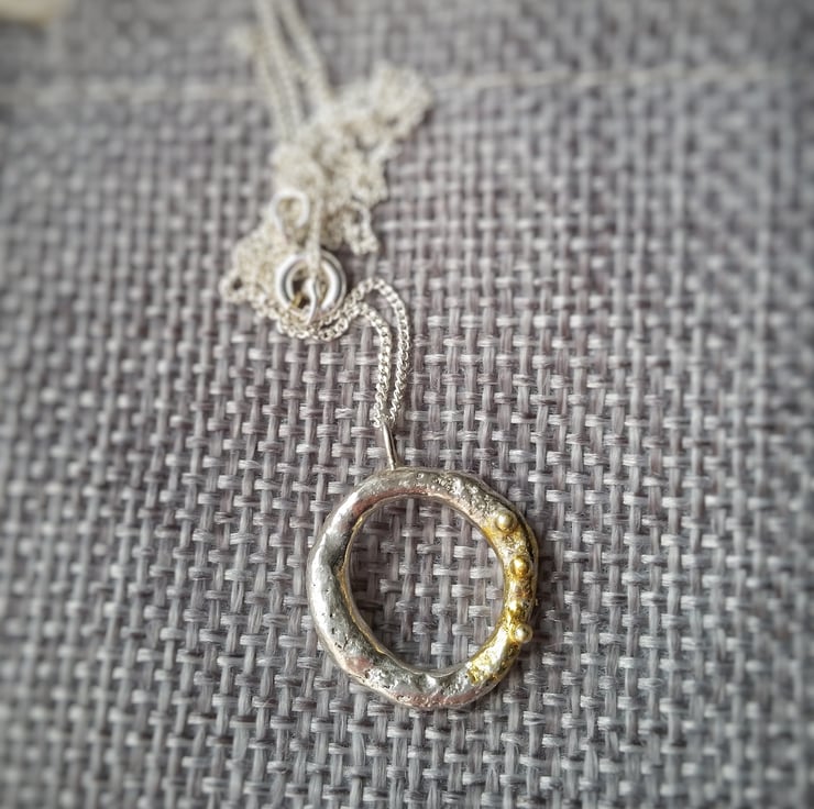 This is an unusual textured sterling silver pendant which has been inspired by my love of Lichen. This quirky little pendant has a random texture and shape making each one unique. Little silver balls sit inside the 'lichen' and a little 24ct gold accent has been added reflecting the golden yellows often found in Lichen...