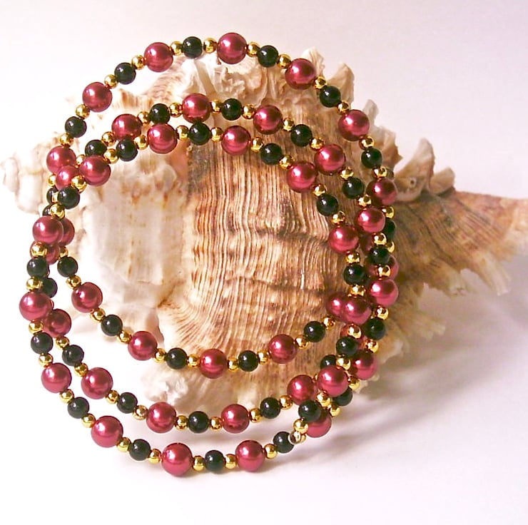 A One of a Kind, handmade, 3-tiered memory bracelet/bangle which I made with glass pearls in a beautiful, warm cranberry colour together with black round beads. These are complemented with gold-toned accents.