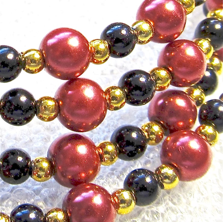 A One of a Kind, handmade, 3-tiered memory bracelet/bangle which I made with glass pearls in a beautiful, warm cranberry colour together with black round beads. These are complemented with gold-toned accents.
