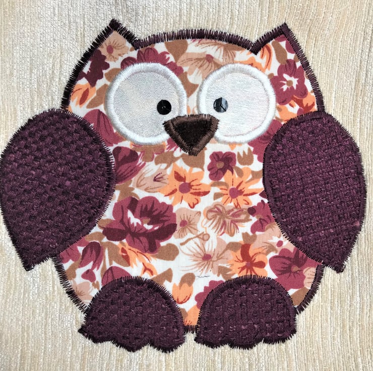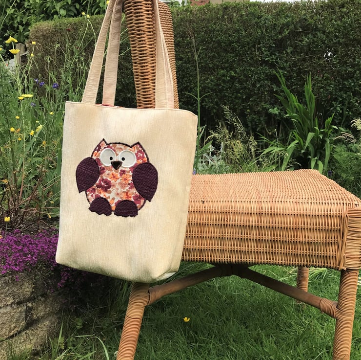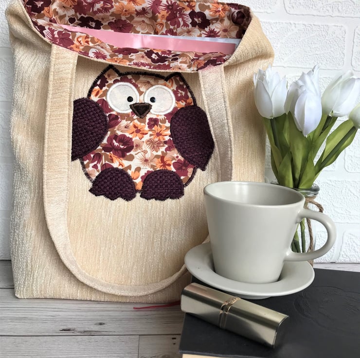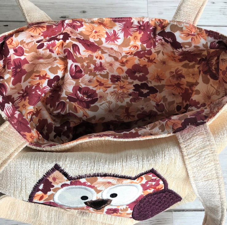 A delightful owl tote bag in textured peachy cream fabric with a cute applique owl. The main body of the owl is made from a floral print fabric in shades of peach, maroon and beige on a white background. The wings and feet are plum coloured roughly woven textured fabric. The owl has a brown velvet beak and cream satin-finish eyes embellished with black sequins. The bag is fully lined with floral print fabric which matches the main body of the owl.