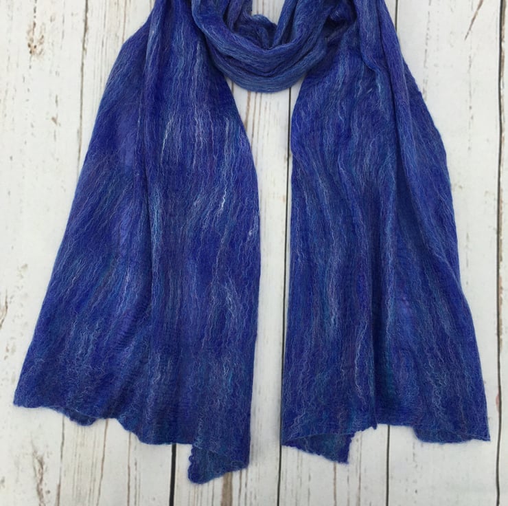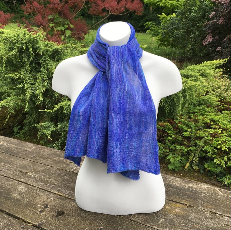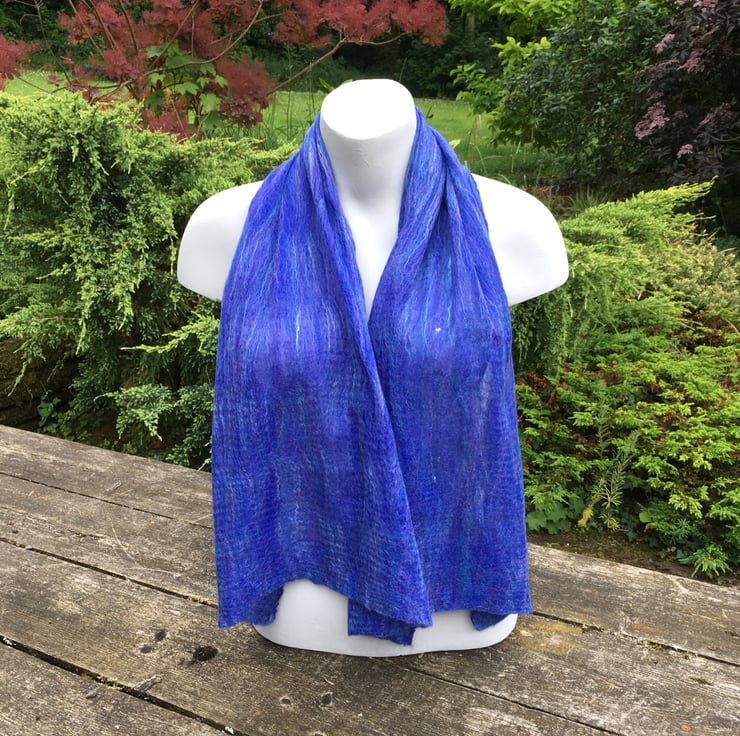 A super soft and lightweight nuno felted scarf that drapes beautifully around the neck. It is perfect for both summer and winter wear and would look fabulous teamed up with any outfit. The scarf is made using a nuno felting process whereby a very fine layer of woollen fibres are laid over both sides of a silk chiffon fabric and manipulated to cause the wool to migrate through the silk and bind with it. The strength of the scarf is provided by the underlying silk allowing the woollen layers to be very fine. The scarf is felted on both sides.