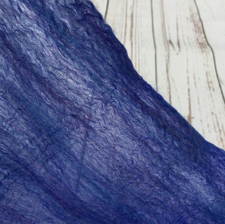The resulting scarf measures approximately 122cm (48") x 40cm (16") and will arrive wrapped in pretty floral tissue paper making it an ideal gift. Perfect as a 7th wedding anniversary "woollen" gift or any other occasion. Full washing instructions and a short description of the nuno felting process are included.