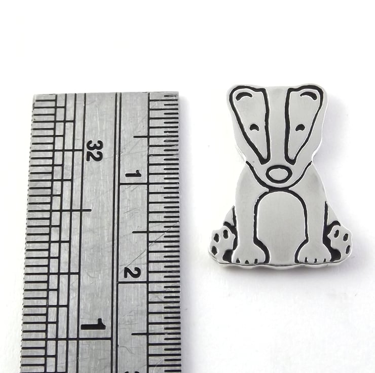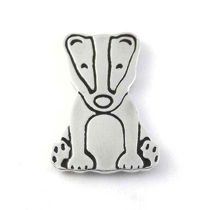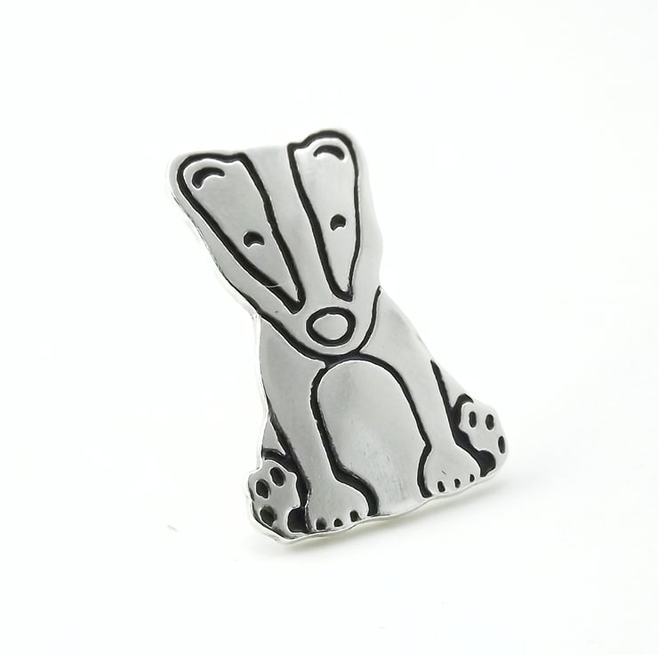 This badger badge/lapel pin/tie tack has been lovingly handcrafted in Shropshire. It is made from sterling silver sheet and is etched before being cut by hand, I then smooth the edges using files and emery paper before it's carefully given its shape using a punch and hammer. a pin is then soldered onto the back. A black resin based enamel is added to the etched areas and then the piece is polished.