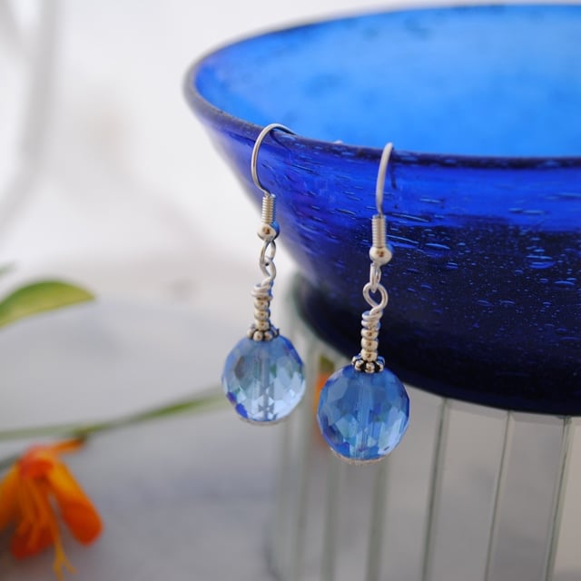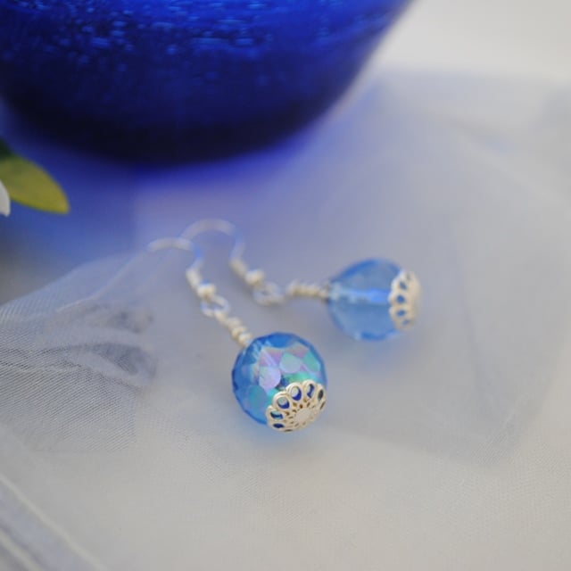 Silver-plated earrings with sapphire beads with small silver beads, silver daisy spacers and silver bead caps - and a hand-wrap finish. Your jewellery will be gift-wrapped in tissue paper - ready to present as a gift or to enjoy for yourself.