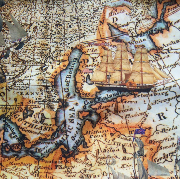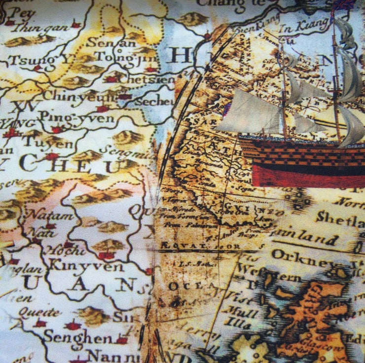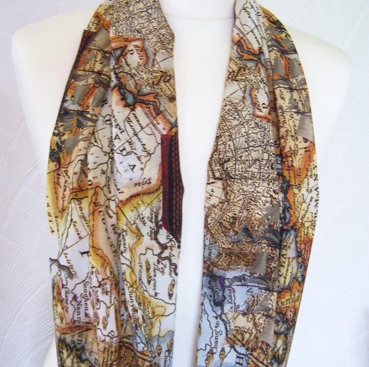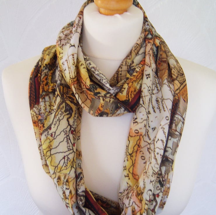 This is a hand made infinity scarf made from a stunning ancient / vintage map print chiffon. This is a lovely quality powder soft chiffon fabric which has a lovely drape to it, and a soft 'peach skin' feel to it.