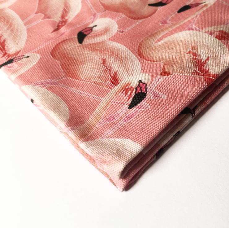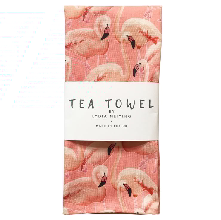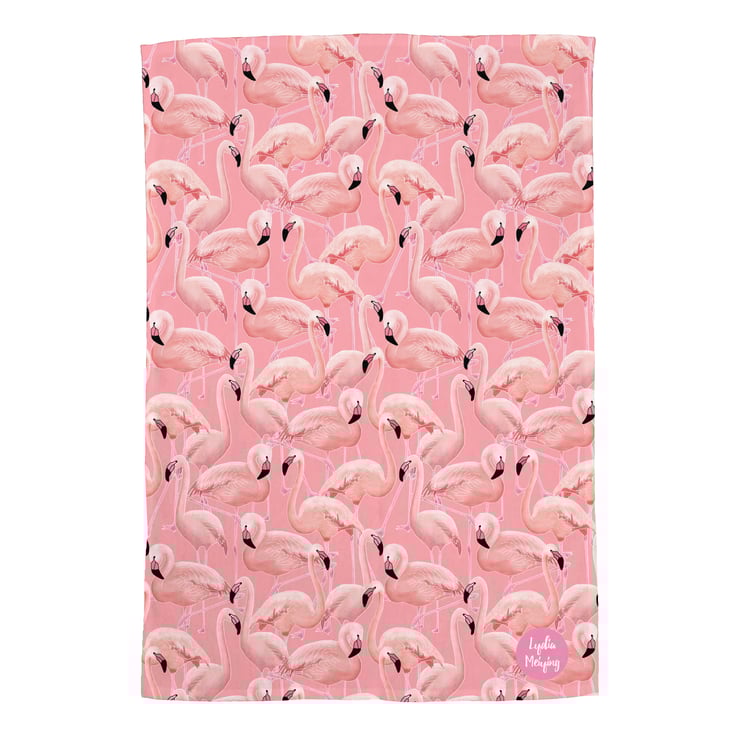 A tea towel featuring a fun flamboyance of flamingos, a perfect addition to any kitchen.