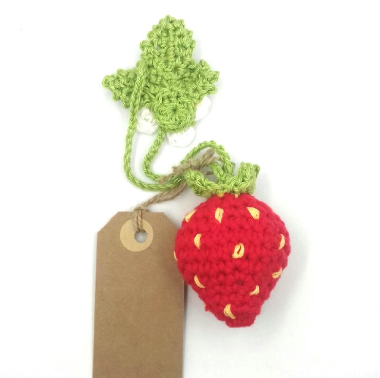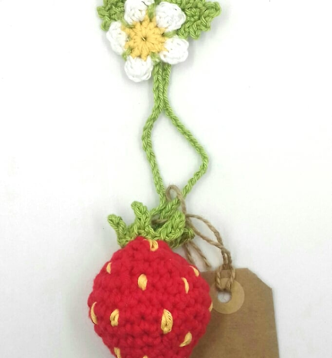 This rosy strawberry would add summer cheer to any room! The fruit is crocheted in a 50/50 cotton and acrylic yarn and the leaves and flowers at the top of the hanging loop are crocheted in 100 % cotton. The strawberry measures approximately 6 cm long and is filled with polyester stuffing. The decoration comes with a tag attached so that you can send it as a keepsake gift and message in one as an alternative to a greetings card. The tag reads 'For You 'although I am very happy to exchange this tag for one with a message of your choice.