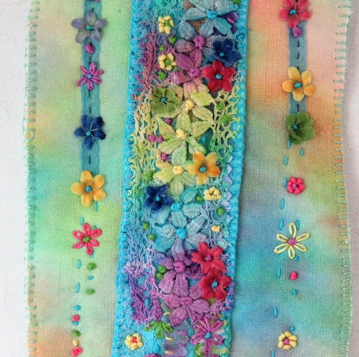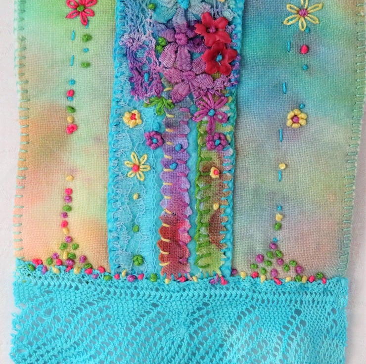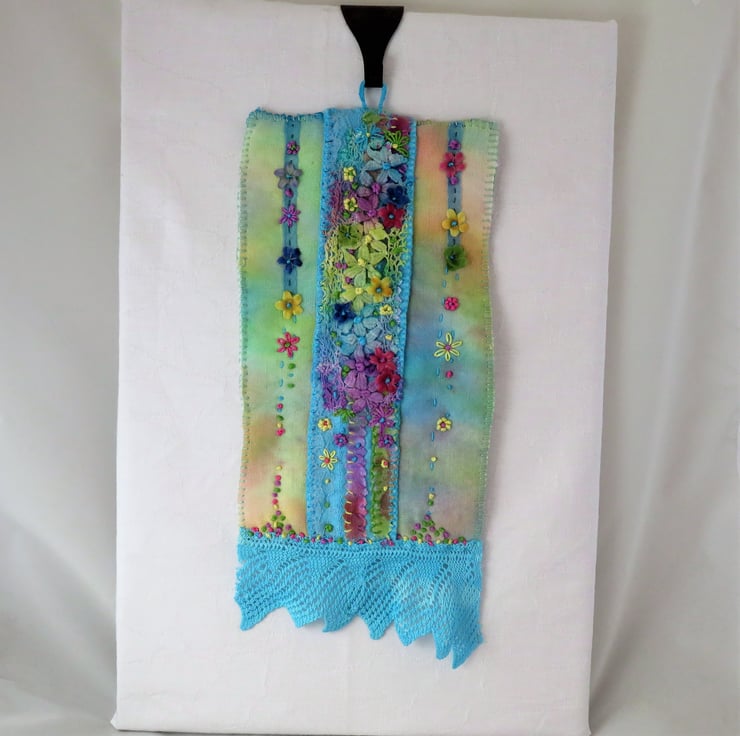 A very pretty hanging featuring hand-painted and hand-dyed scraps of vintage linens and lace, combined with hand embroidery and hand-painted silk flowers .