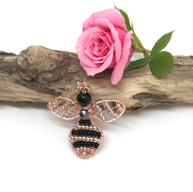 I have created this Bee pendant with wire wrapping techniques using rose gold coloured copper wire. Black and rose-gold coloured seed beads for the body wrapped with fine rose gold coloured copper wire and roseline seed beads for the wings. Czech round and faceted bead for the head and top of body. The pendant is completed with an 18” rose-gold coloured chain.