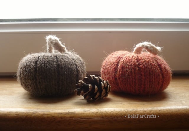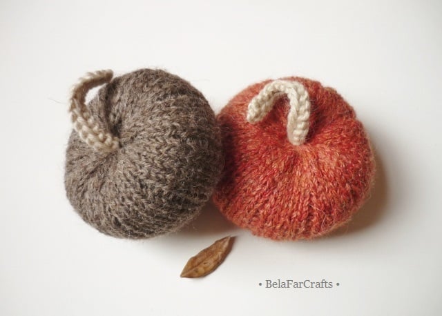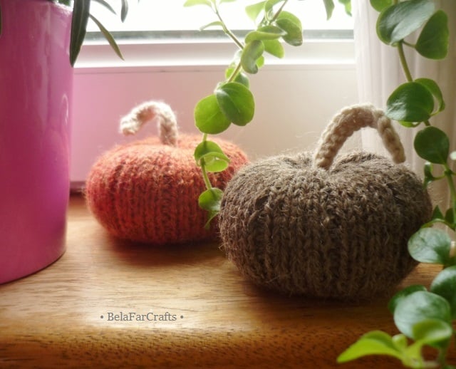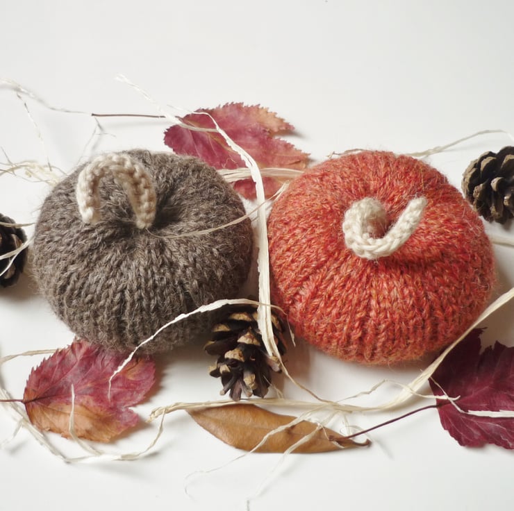These handmade pumpkins will add the feeling of Fall anywhere you place them: your office desk, the crafts room, a fireplace mantel or kitchen counter. I used lovely yarns of British sheep wool and alpaca in warm shades.