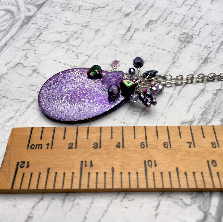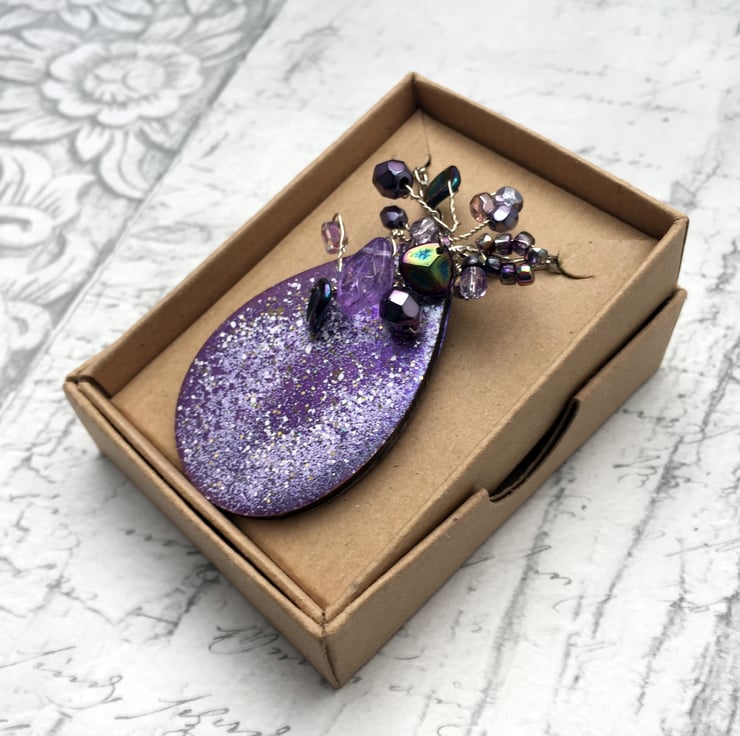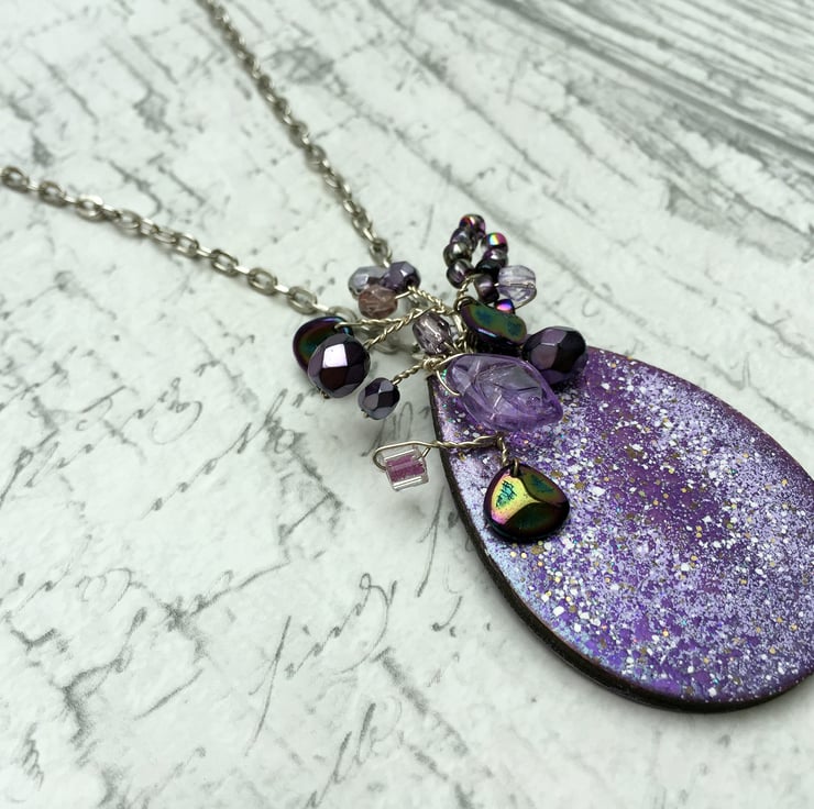 This pendant in shades of purple, lilac and white has been created by adding multiple layers of jewel enamel or Ultra Thick Embossing Enamel (UTEE) onto a wooden (FSC approved) teardrop blank. The Jewel enamel is made of multiple colours from white through to lilac and purple as well as some copper glitter thrown into the mix.