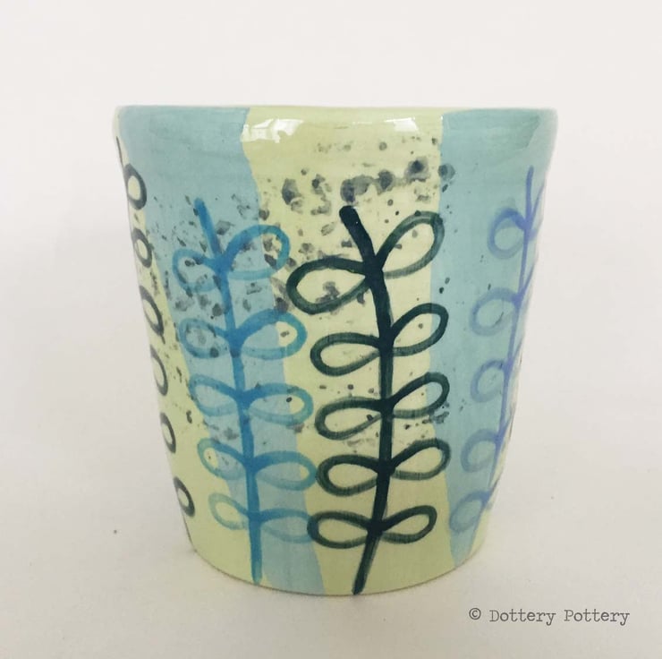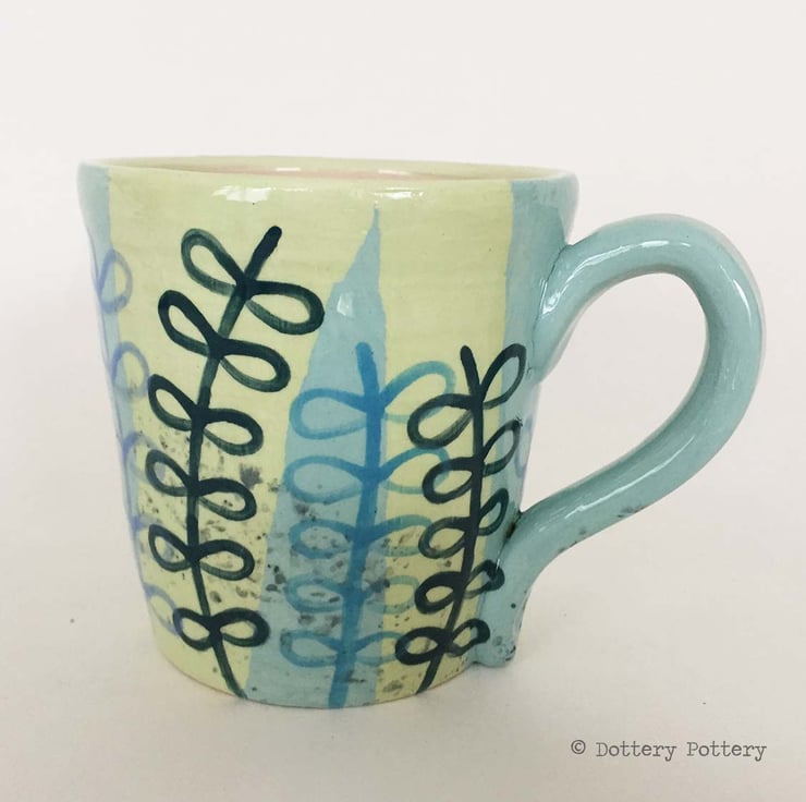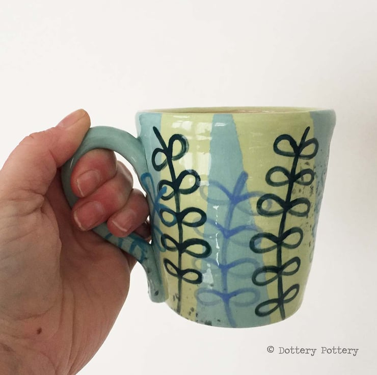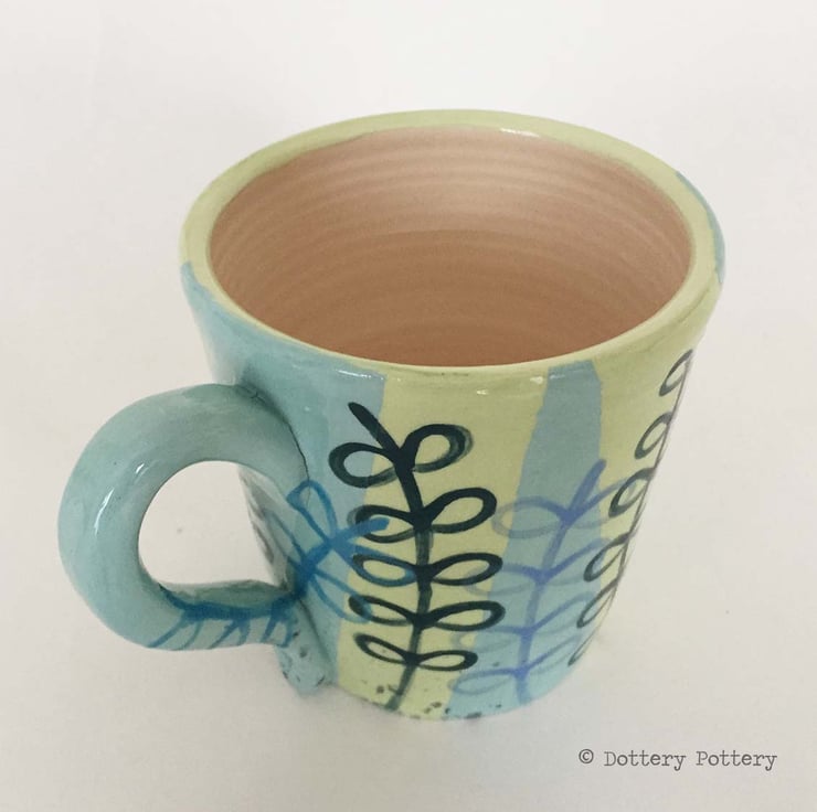This handthrown pottery mug is made from white earthenware clay. It has been thrown on the pottery wheel and decorated using various techniques with colour and pattern. The mug has been finished in a clear, glossy glaze (food safe). It has been fired twice.I love the gorgeous colours of the Springtime and Summer flowers and use this as a theme in my work quite often. This mug measures 10cm high x 12cm wide. Was £15, now £10.50