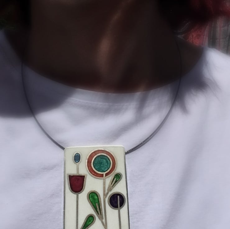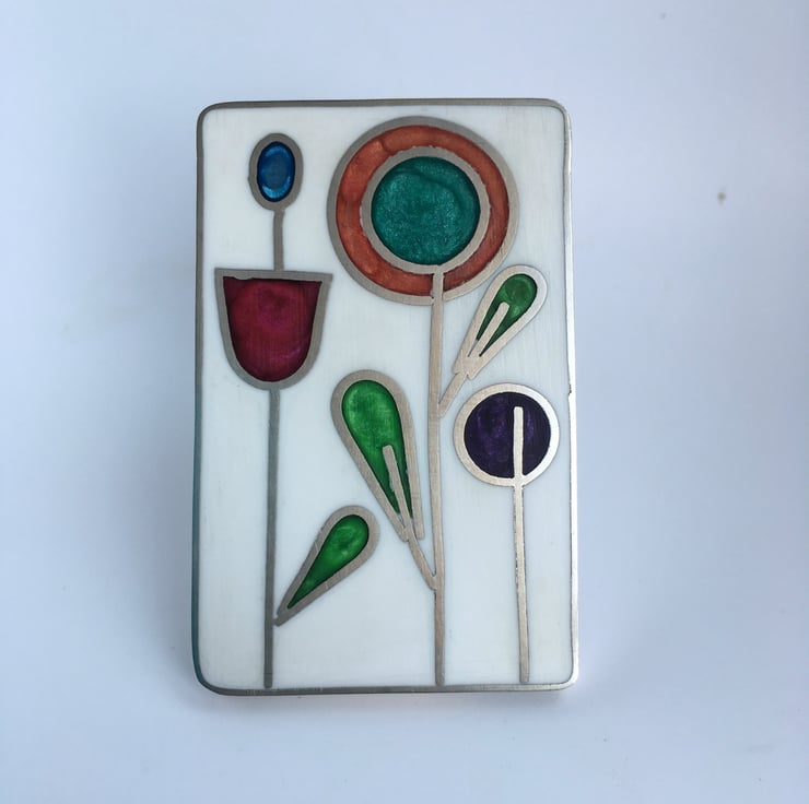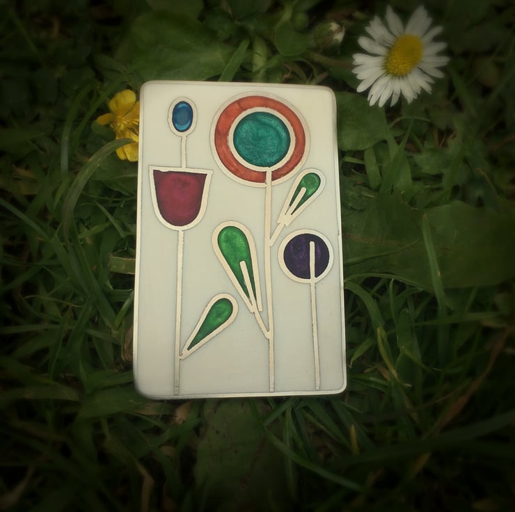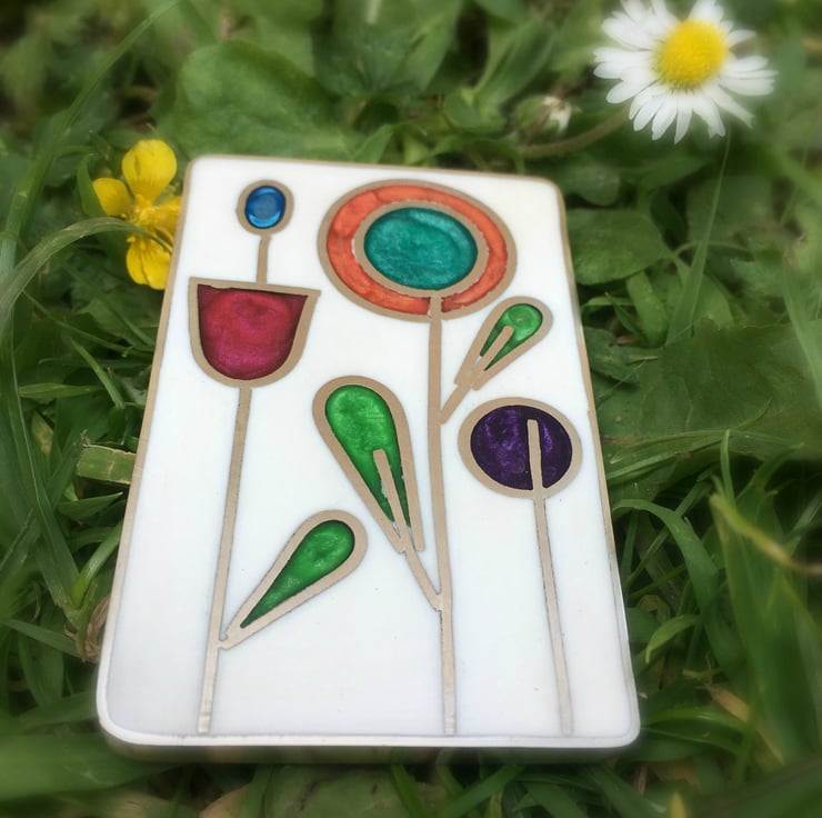 This piece is made to order in brass using hand cut strips of metal that are then formed and soldered individually onto a base, then each section is painstakingly filled with hand mixed coloured resin that is polished to a shiny finish.