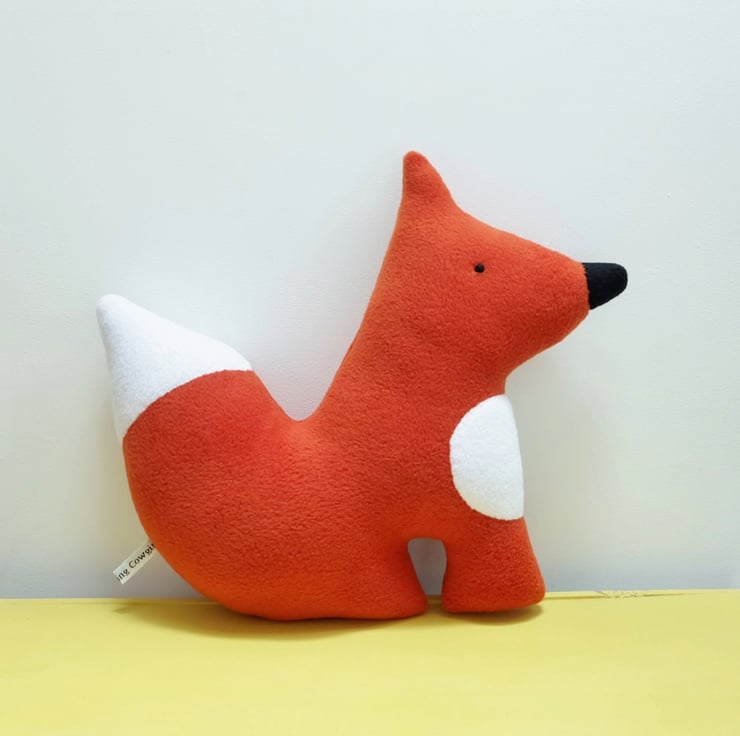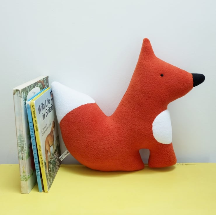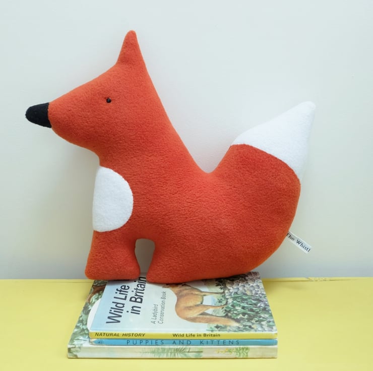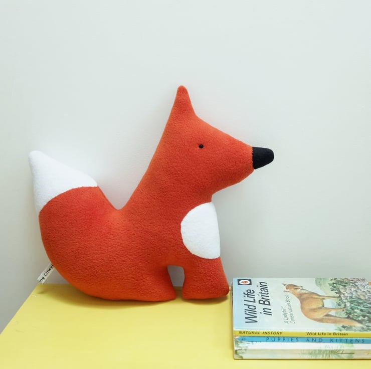 Measuring around 25cm high (just under 10 inches) and 35cm long (just under 14 inches), the fox is filled with toy safety standard, polyester stuffing. He may be hand washed and hung to dry.