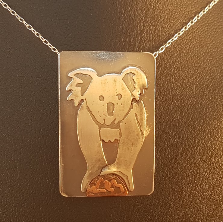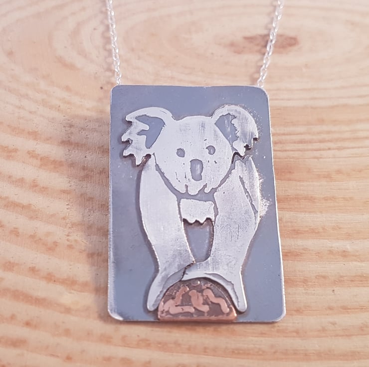 A pretty koala necklace, like wearing a piece of art.The koala has been hand cut from a sheet of sterling silver, and etched with the details. the branch the koala is standing on has been cut from copper and etched. They have then both been soldered on to a rectangle of silver, and two loops soldered to the back for the chain. the necklace has then been oxidised.
