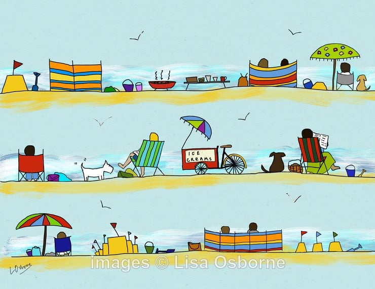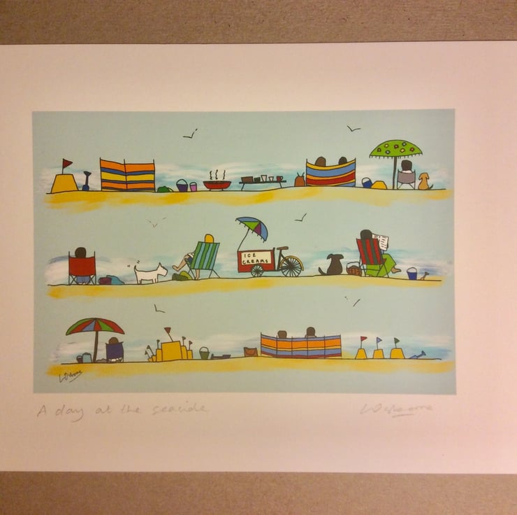 Day at the seaside - colourful open edition print of a sunny day on the beach. Gloriously hot sunny days and holidays by the seaside.