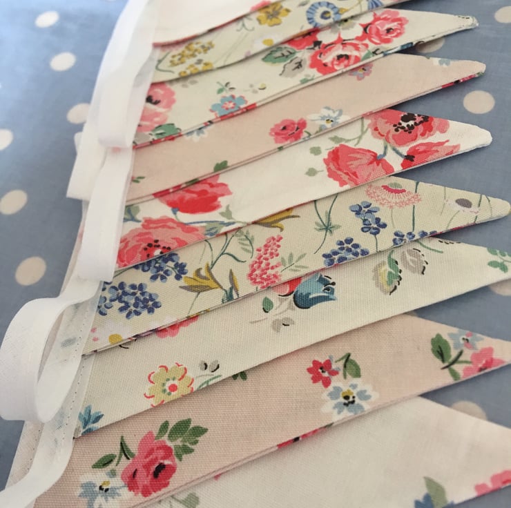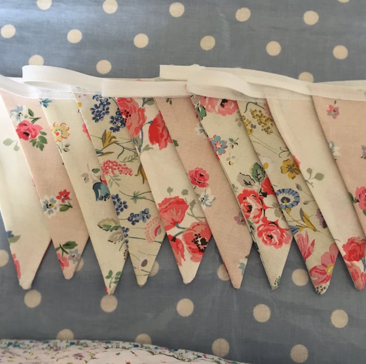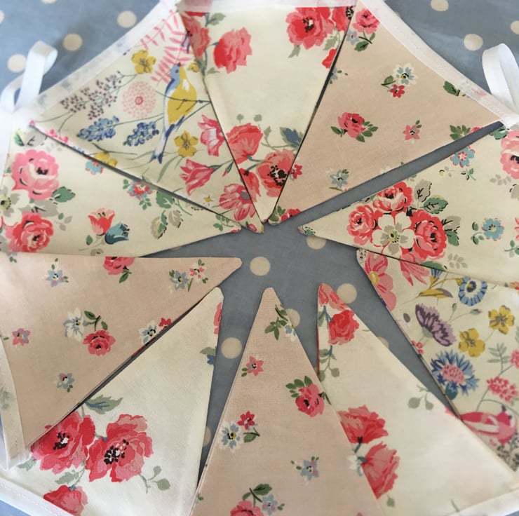 10 ft bright and colourful bunting, each flag is 7" tall, double sided so the same fabric on the back and made with cotton fabrics then finished with white bias binding