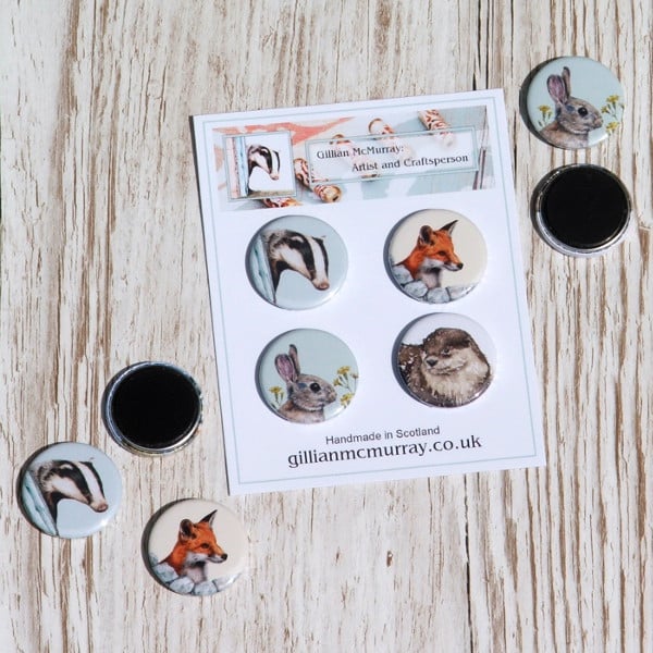 This is a set of 4 fridge magnets with a British wildlife theme. One each of a badger, red fox, rabbit and otter. They are a colourful addition to your fridge or any other metal surface. Each magnet is 2.5cm (approximately 1 inch) wide with a flat, black magnet attached at the back. All handmade by me, and packaged on a card backing in a cellophane bag.