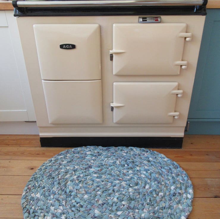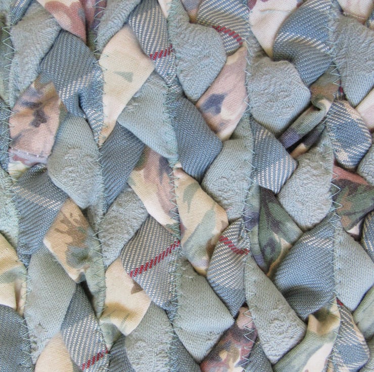 A hand braided, large oval rug, using a fabric combination of;