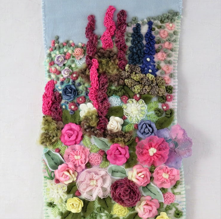 A brightly coloured, textured, mixed media hanging , incorporating hand-painted and hand-dyed scraps of vintage linens and lace, combined with hand embroidery, hand-painted lace flowers, paper roses and embroidered flowers and foliage.