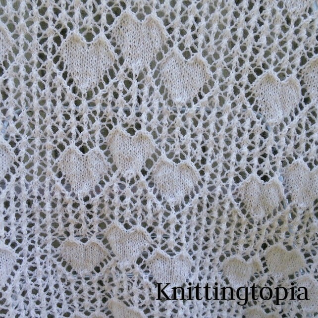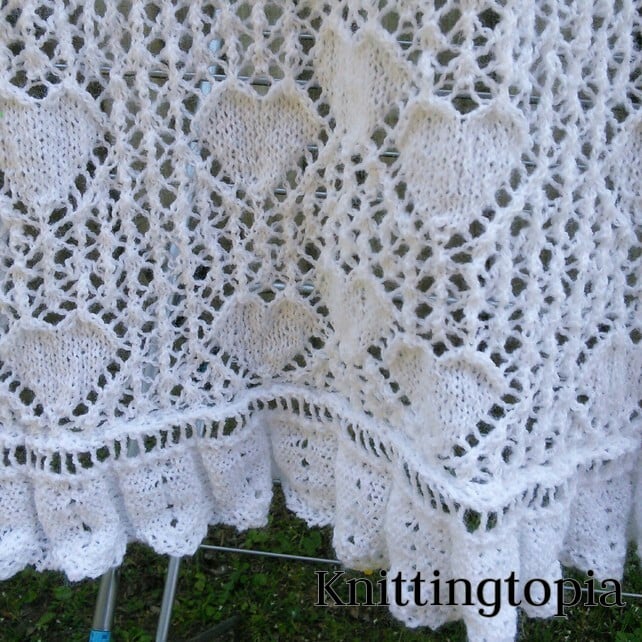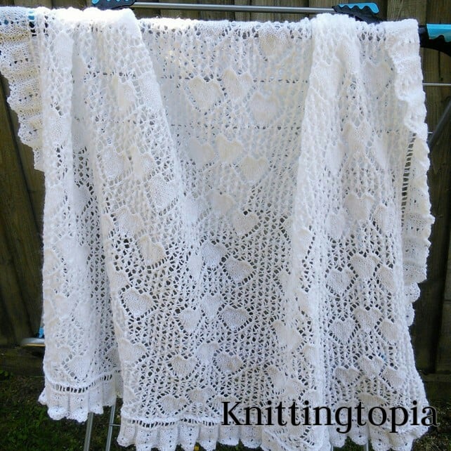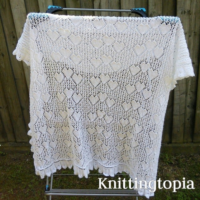 This beautiful baby shawl has been hand knitted using pure white lace weight yarn which has a beautiful drape to it. The shawl has been hand knitted over many hours and features a lacy design with clusters of three hearts and is finished off with knitted border. This sweetheart shawl is perfect for both baby girls and boys and is just perfect for a christening. It would make a lovely gift which can be treasured for years to come and maybe handed down the family.