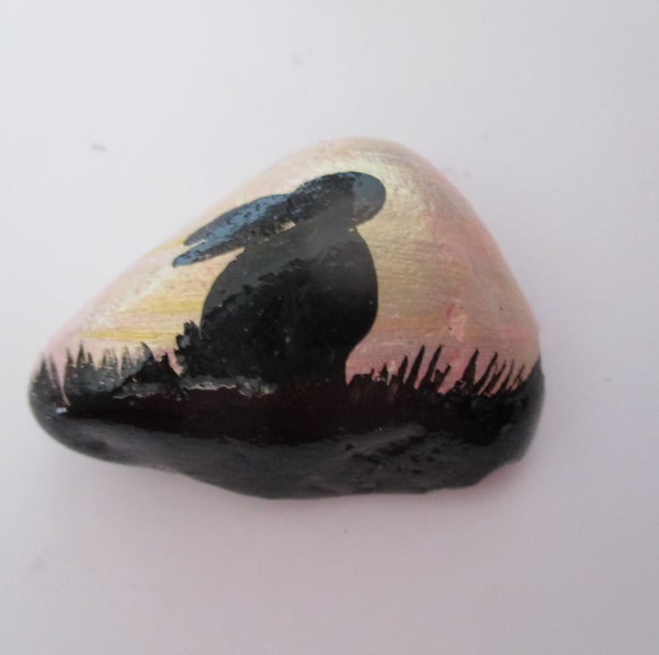 A set of hand painted pebbles featuring silhouettes of wee bunny rabbits in black against sky background in pink / gold colours.