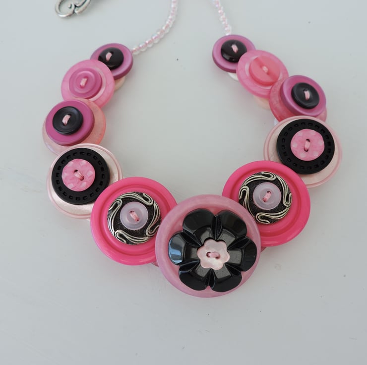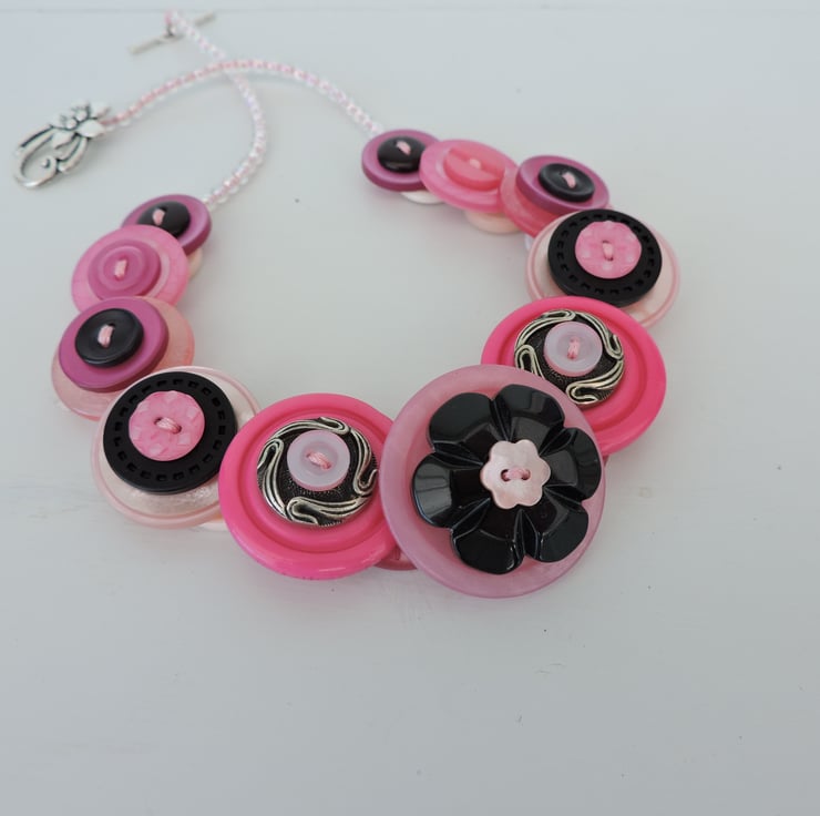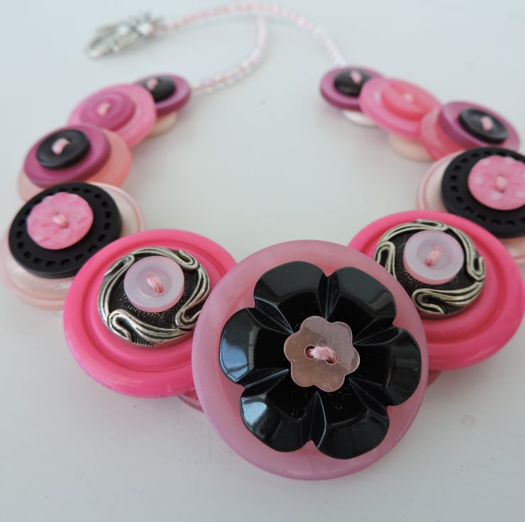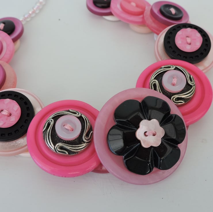 Layered, stacked, threaded and knotted and finished with little Aurora Borealis beads which sit comfortably around the back of the neck and a silver plated toggle clasp.