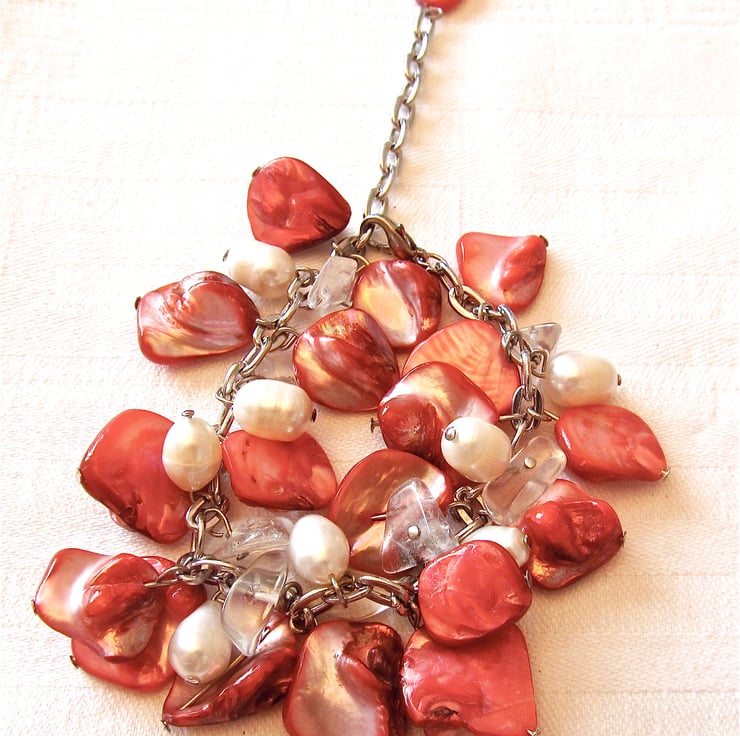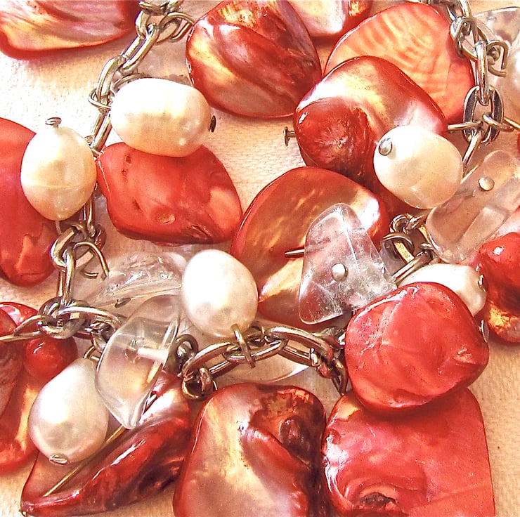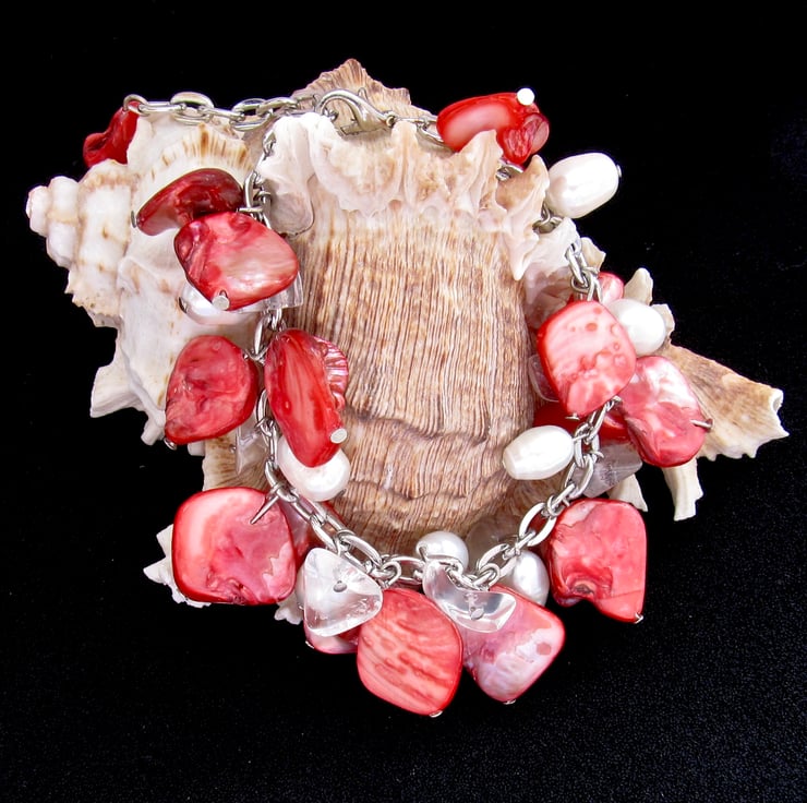 Nineteen tactile, chunky, cherry red Mother of Pearl large nuggets have been paired together and fixed onto the central chain. To balance the design, I’ve added 8 knobbly pure white potato pearls and these are twinned with clear, acrylic chip beads. Each nugget and pearl almost spill over each other to be seen, ensuring that this bracelet is highly visible.