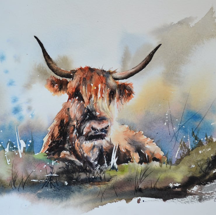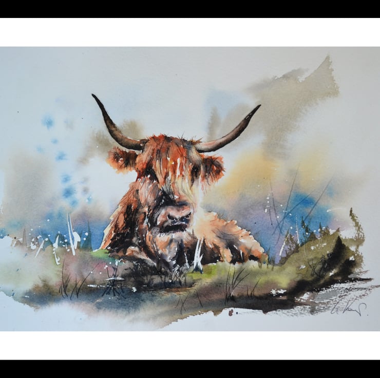 My paintings are inspired by places, memories and feelings. Sometimes I start with a sky and see where it leads me. This particular painting is of a Highland Cow, do not disturb, he's having a nap....