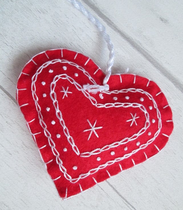 A little red felt heart, lightly stuffed and hand embroidered in white to add a little Scandi style to your tree or a special present.