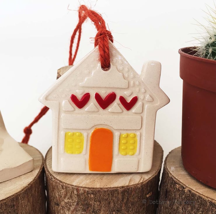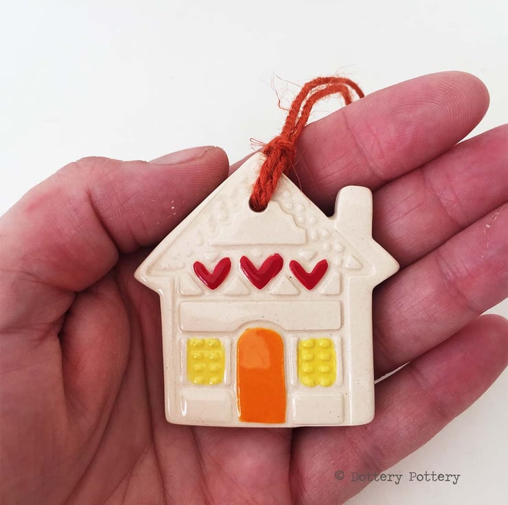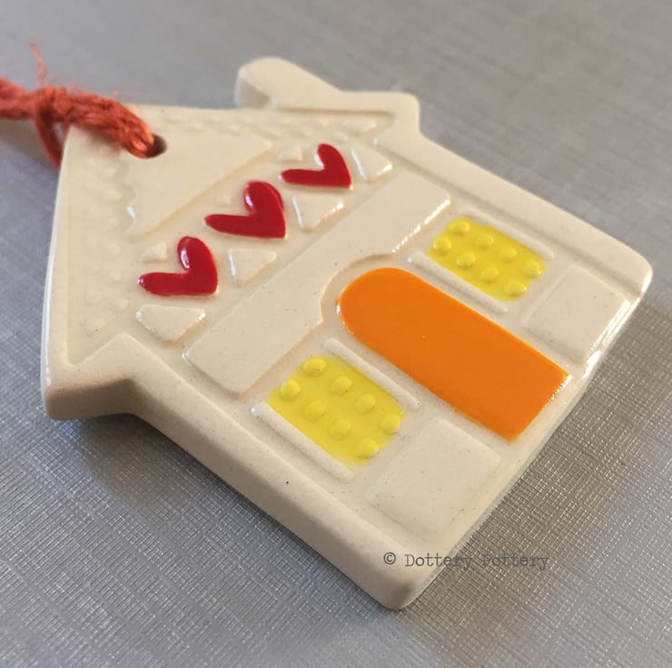 This little pottery house decoration is made from white earthenware clay and decorated in bright, bold colours. It has been fired twice and finished with a glossy glaze for a lovely smooth finish. It measures 5 x 5cm and hangs from a matching brightly coloured string.