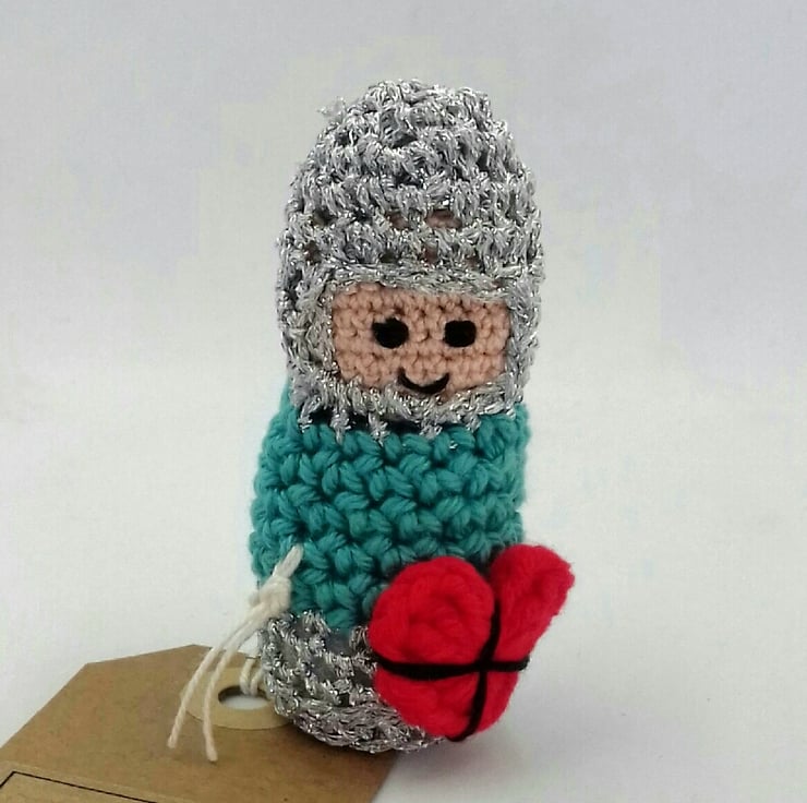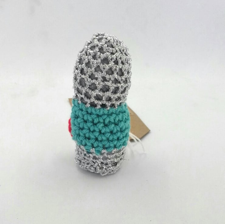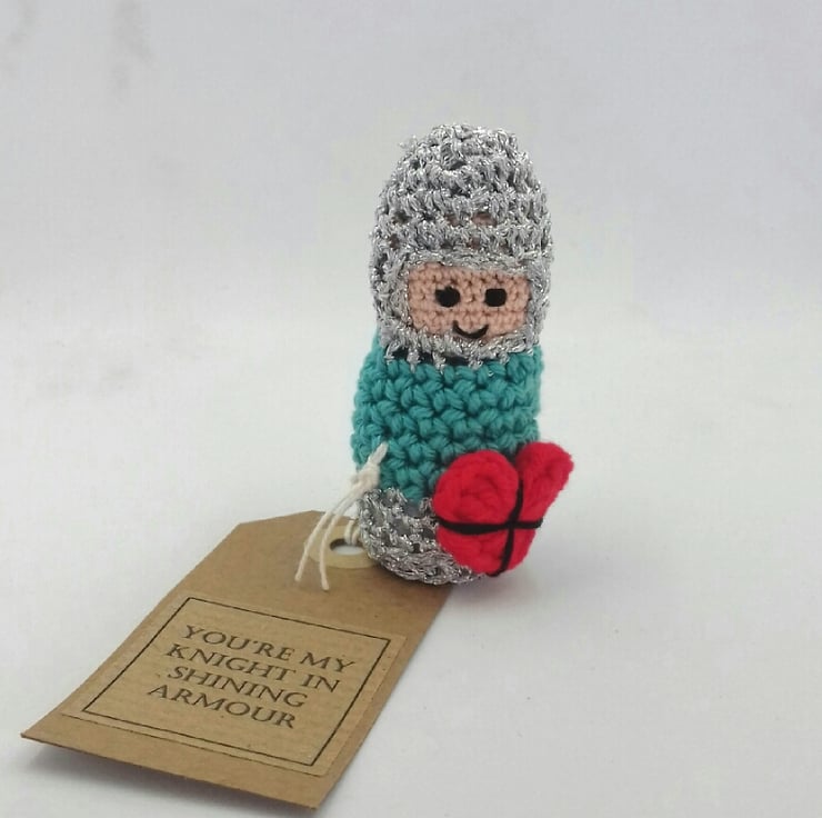 This little fellow is all ready to deliver a message on your behalf and would make a lovely keepsake alternative to a greetings card. He is crocheted in a mix of yarns from a pattern adapted from one by Lucy Ravenscar. He is filled with polyester stuffing and has a metal washer in the base enabling him to stand easily. He carries a heart - shaped shield and there is a tag attached which reads 'You are my knight in shining armour ' although I am very happy to exchange this tag for one with a message of your choice.