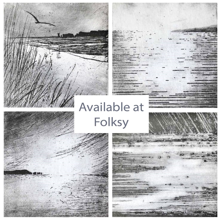 An original etching print of light shining on the ocean surface with a hazy headland in the distance. This listing is no.3 in an edition of 65 printed in black ink on white paper. Image size 6x6cm ( approx 2.5x2.5inch) on paper 13.5x21cm (approx8.25x5.25inch).