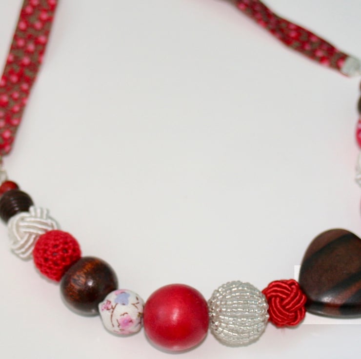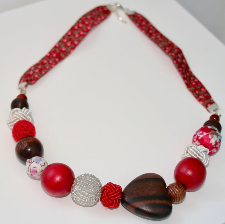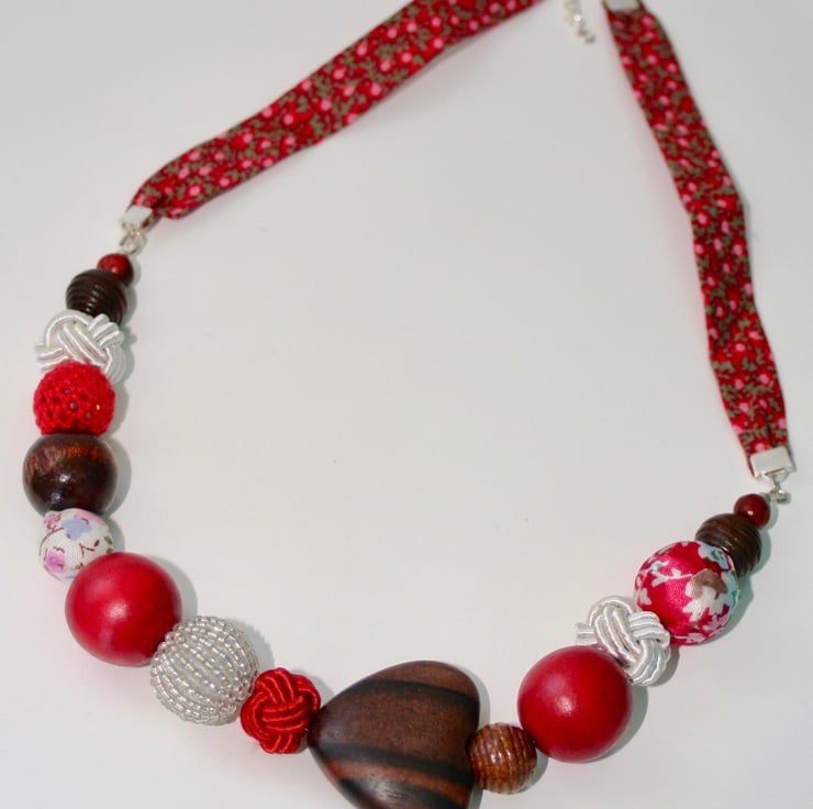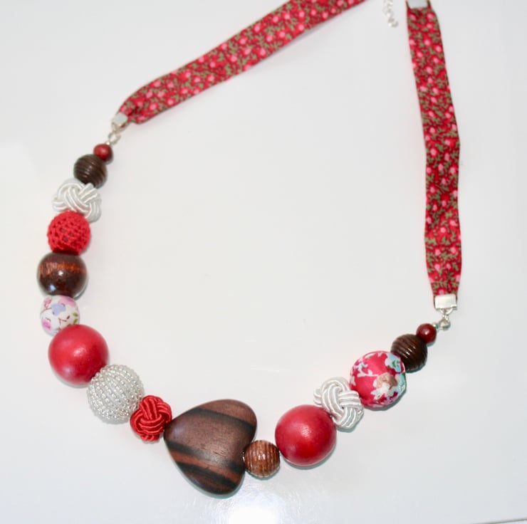 A chunky statement necklace made with a mixture of lovely large beads in textiles and wood. A beautiful large striped natural wood heart is the focal point. The beads hang from a hand sewn flower patterned red ribbon. The necklace fastens with a silver plated lobster claw clasp.