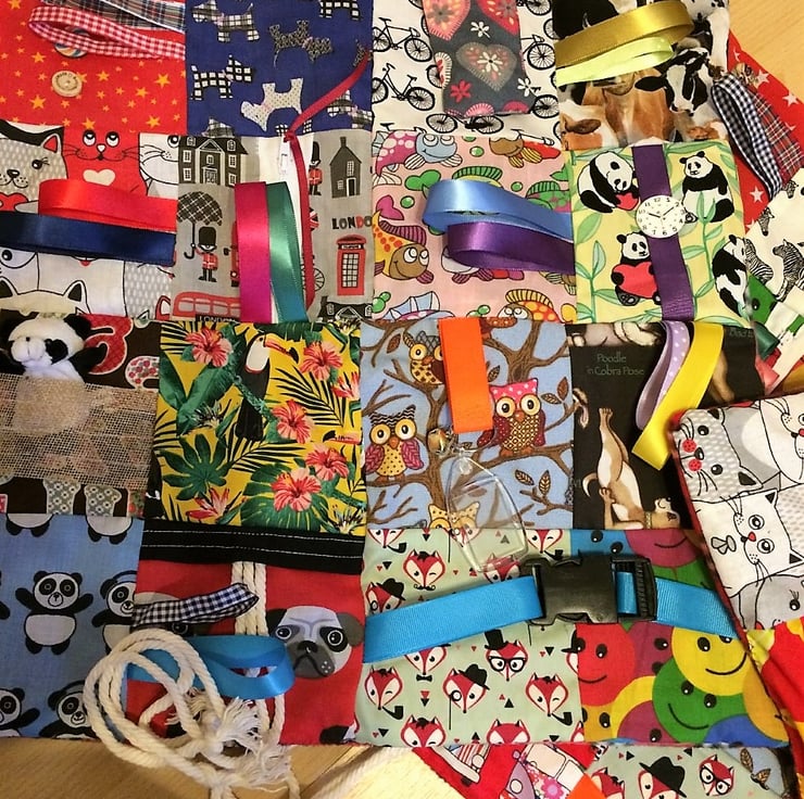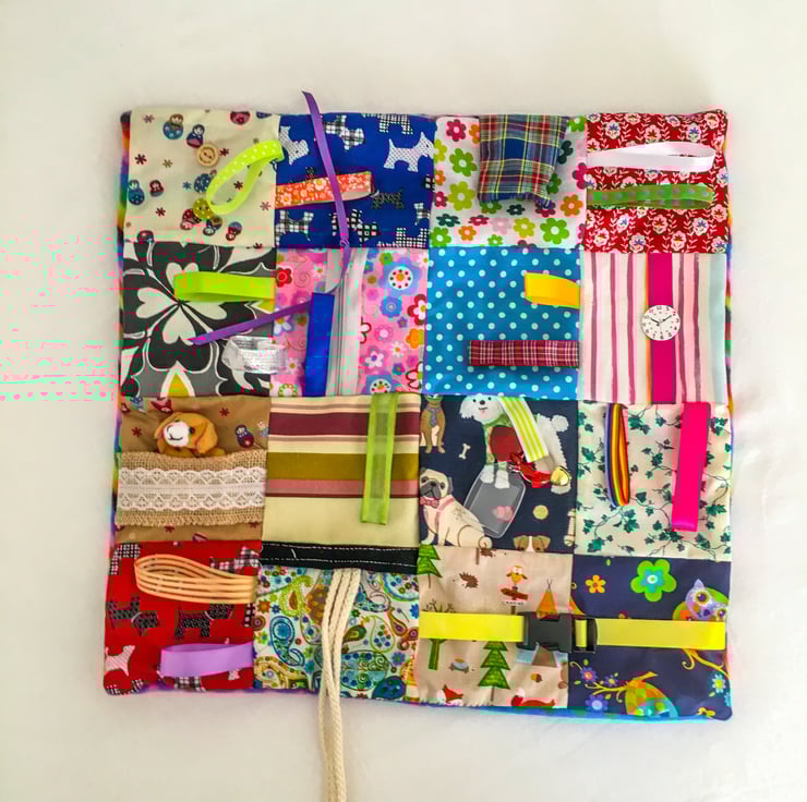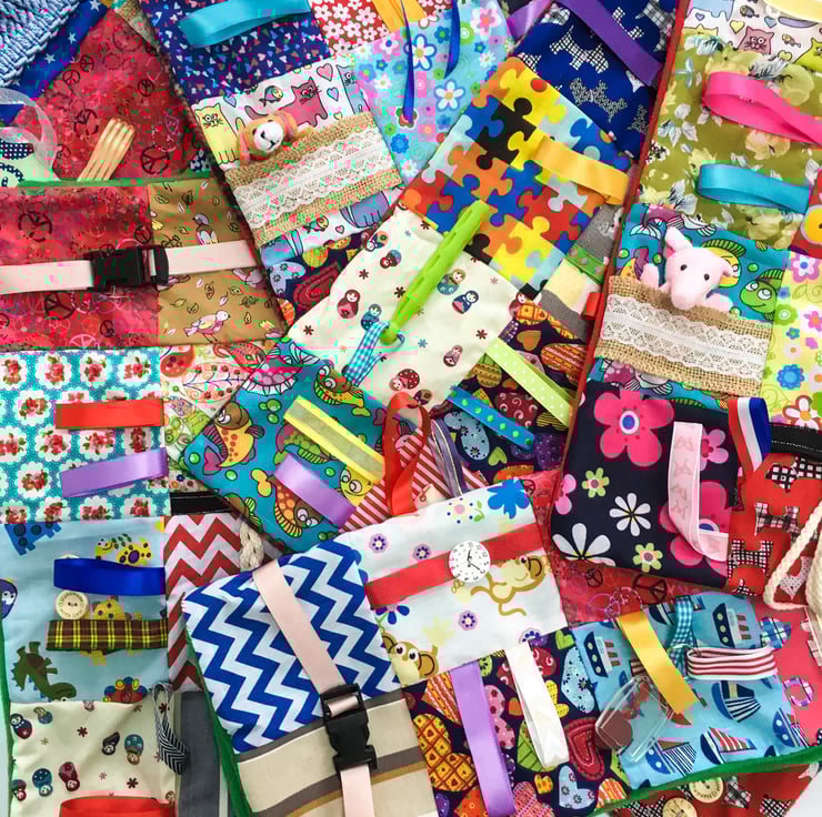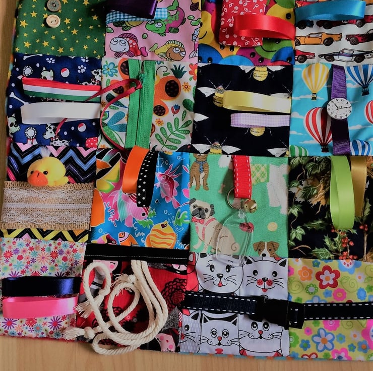 My dementia fidget blankets are made with love , and no two are alike. and fabrics change all he time the photos are to give you n idea of what they look like ,...These fidget blankets are very helpful for maintaining fine motor skills and encouraging activities of daily living such as using buttons, zippers, laces, , etc. In addition, the fabric prints can evoke fond memories, the activities keep restless minds and fingers busy, and the various fabrics, ribbons beads and bells and squeakers which all stimulate