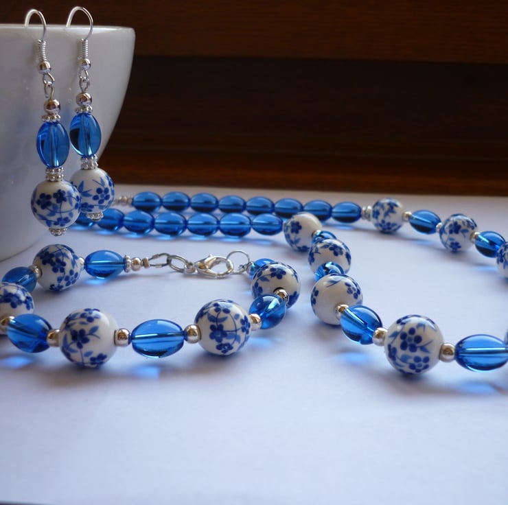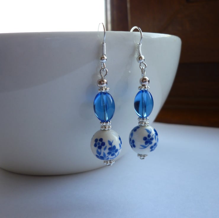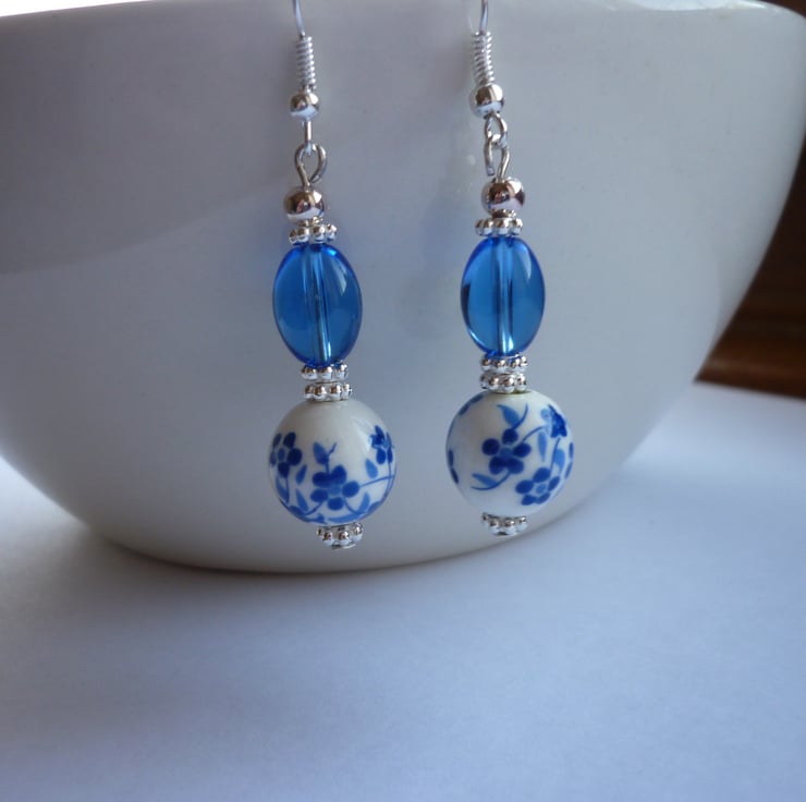 THE EARRINGS HAVE BEEN MADE WITH 12MM BLUE AND WHITE FLORAL DESIGN PORCELAIN BEADS ALONG WITH 10MM BLUE GLASS BEADS, SILVER PLATE DAISY SPACER BEADS, SMALL ROUND SILVER PLATED SPACER BALLS AND FINISHED WITH SILVER PLATED FISH HOOK EAR WIRES.